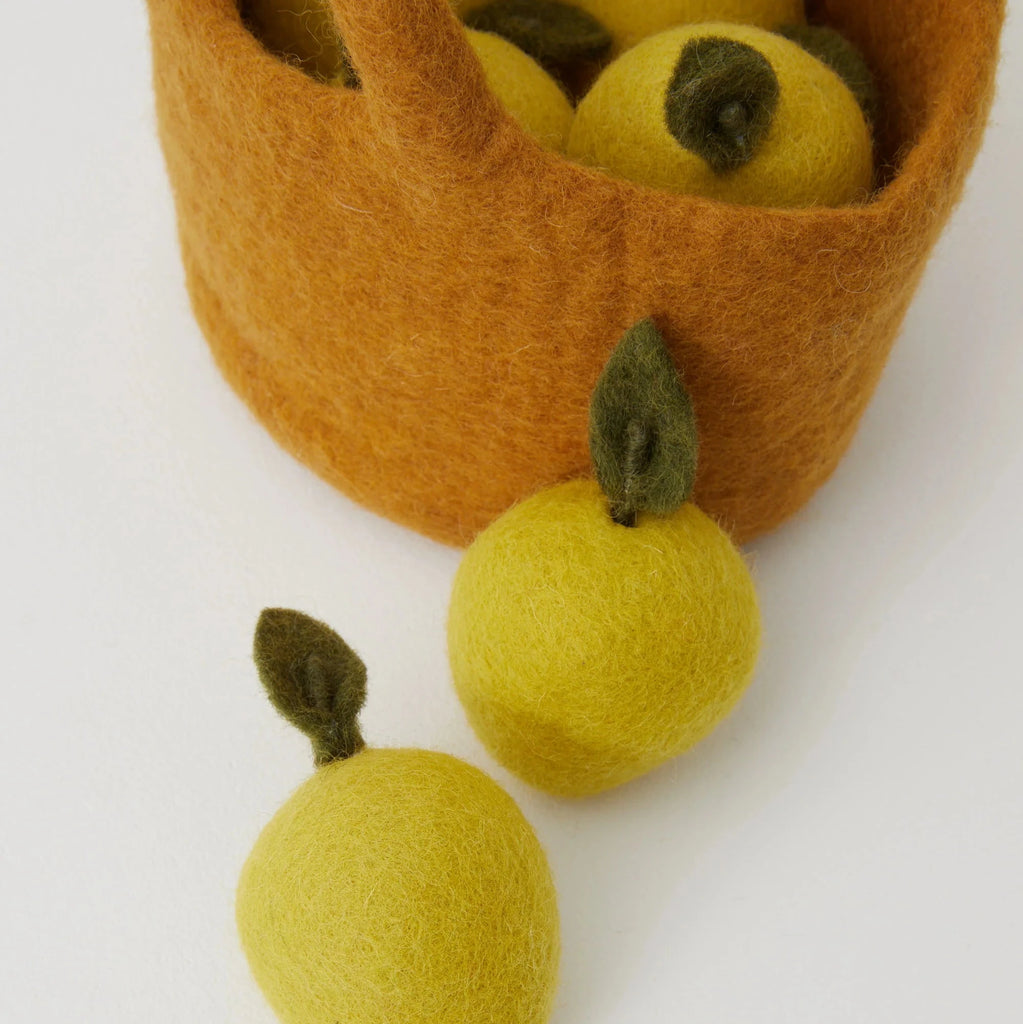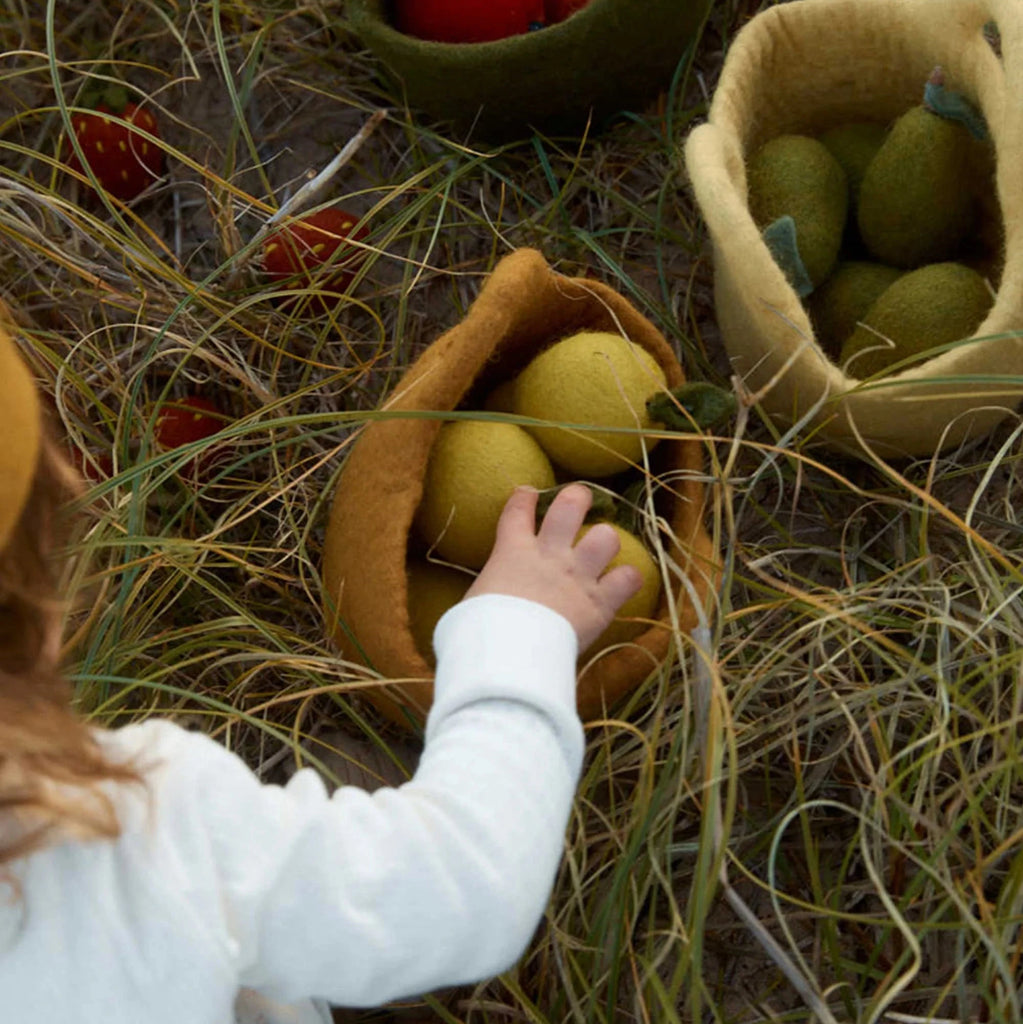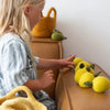 This golden basket features 7 juicy lemons nestled cozily inside, perfect for children of all ages. Each lemon is crafted from 100% felt wool, making them safe and tactile for little hands. The crate ensures easy storage and adds a touch of realism to playtime activities like market shopping or kitchen play. This eco-friendly set is ideal for encouraging imaginative play and learning about healthy eating in a fun, engaging way.