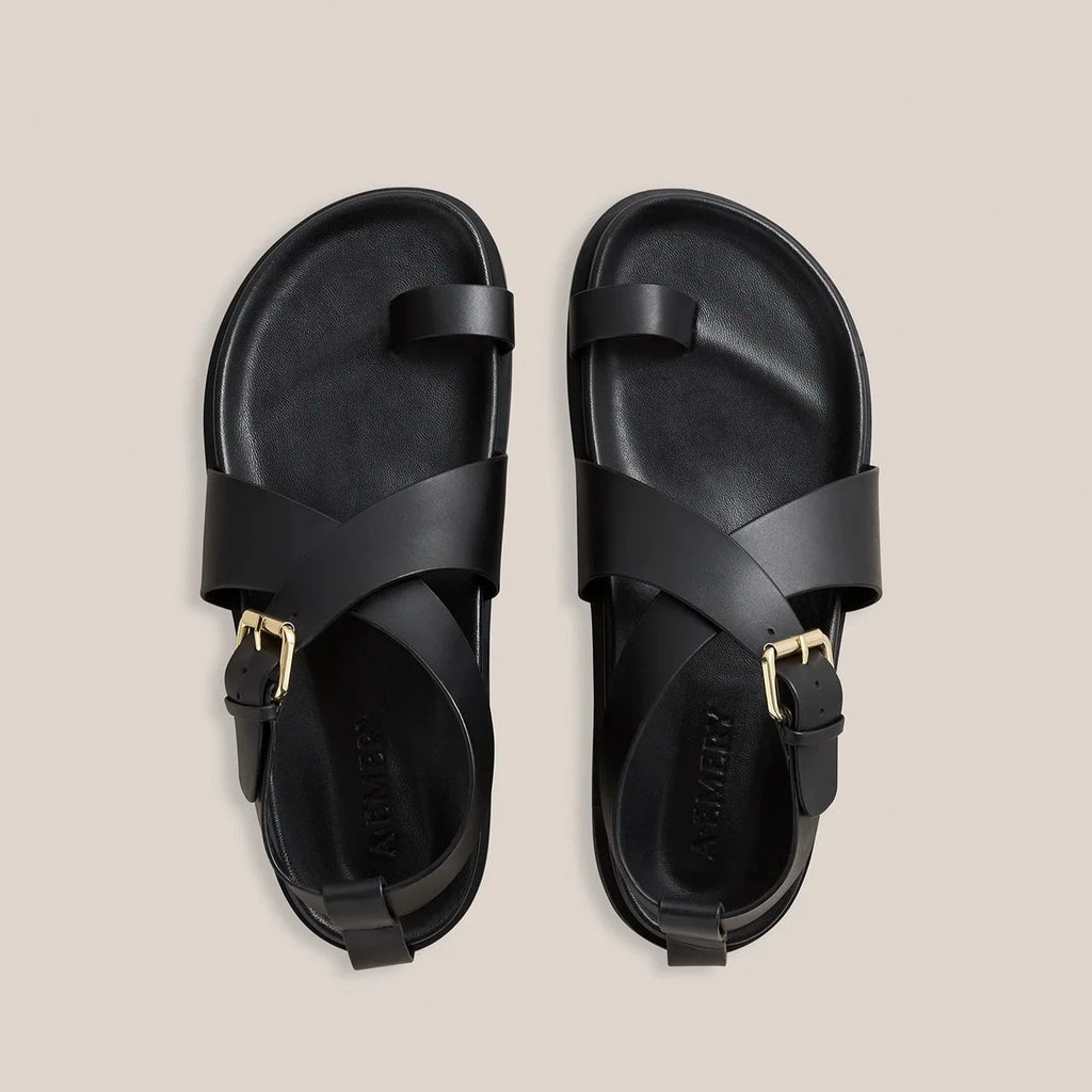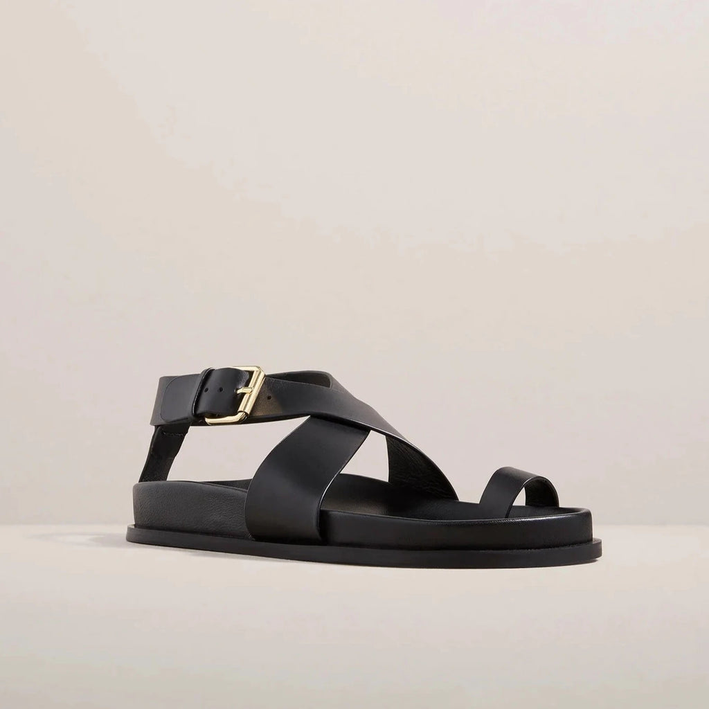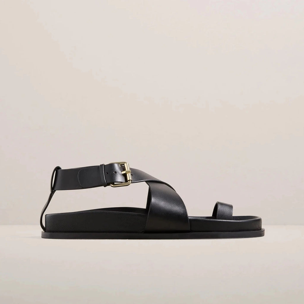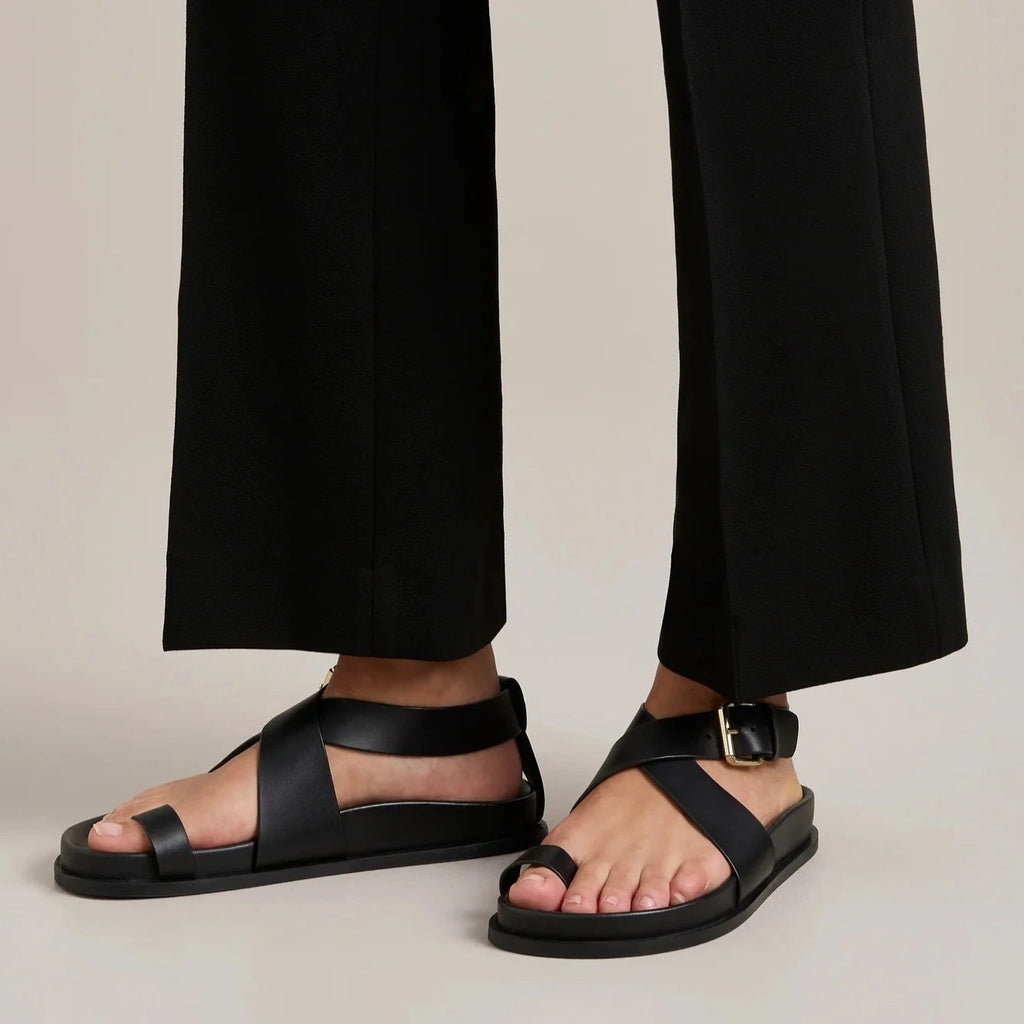 The Dula Sandal sits atop our moulded footbed, featuring a toe hold and two criss-cross straps that encase the foot before wrapping around the ankle and finishing with a soft gold buckle.