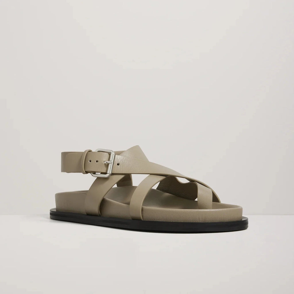The Elbert Sandal sits atop a moulded footbed with diagonal straps that wrap around the foot forming an ankle strap, secured with a silver statement buckle.