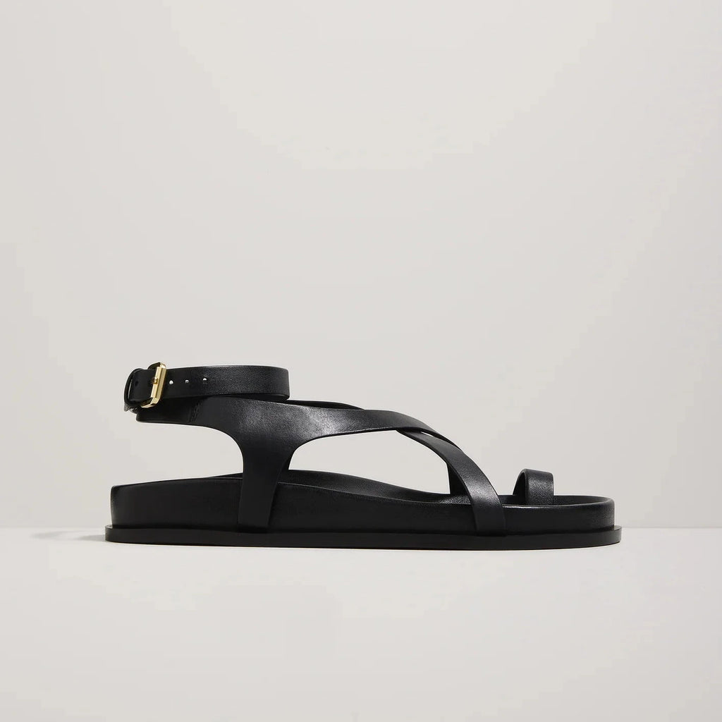 An iteration of our most popular style, the Jalen Slim sits atop our moulded footbed, featuring a toe hold and two criss-cross straps that encase the foot and finish with a soft gold buckle around the ankle.