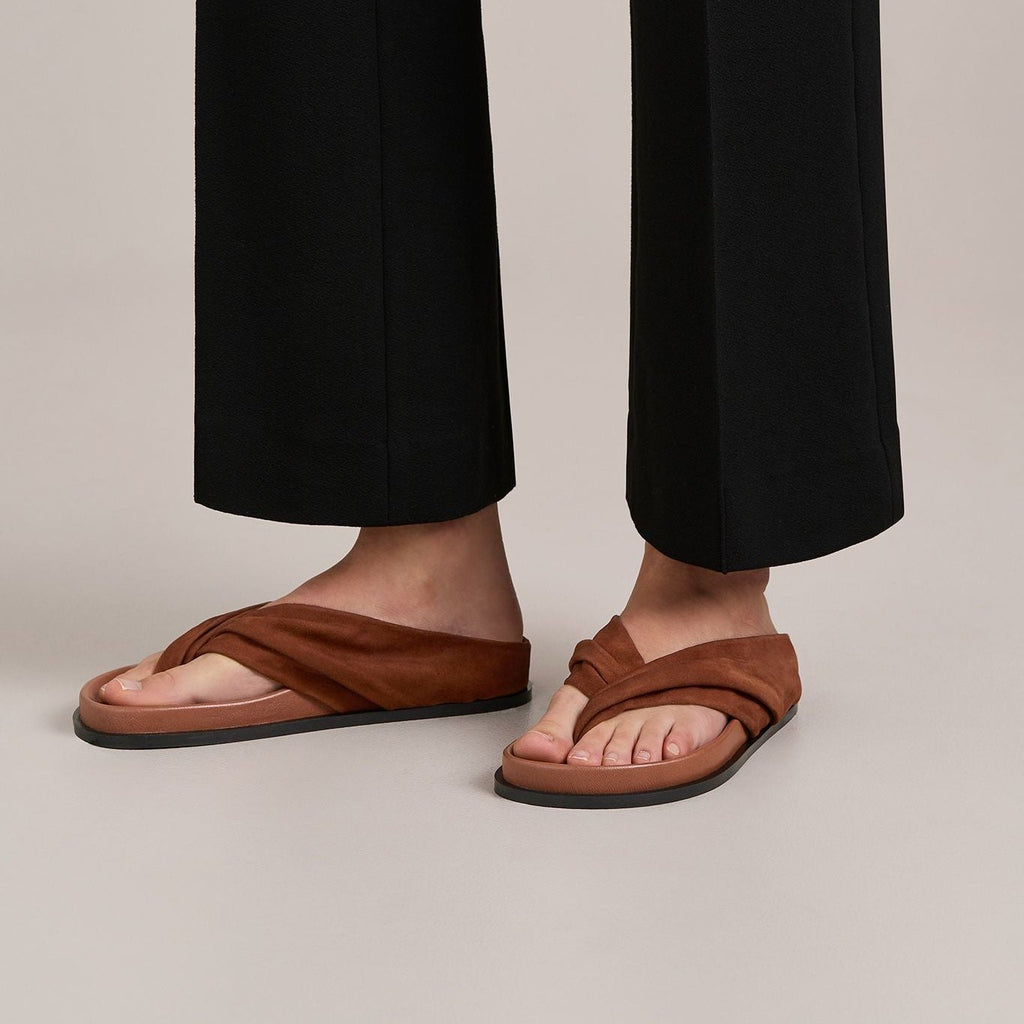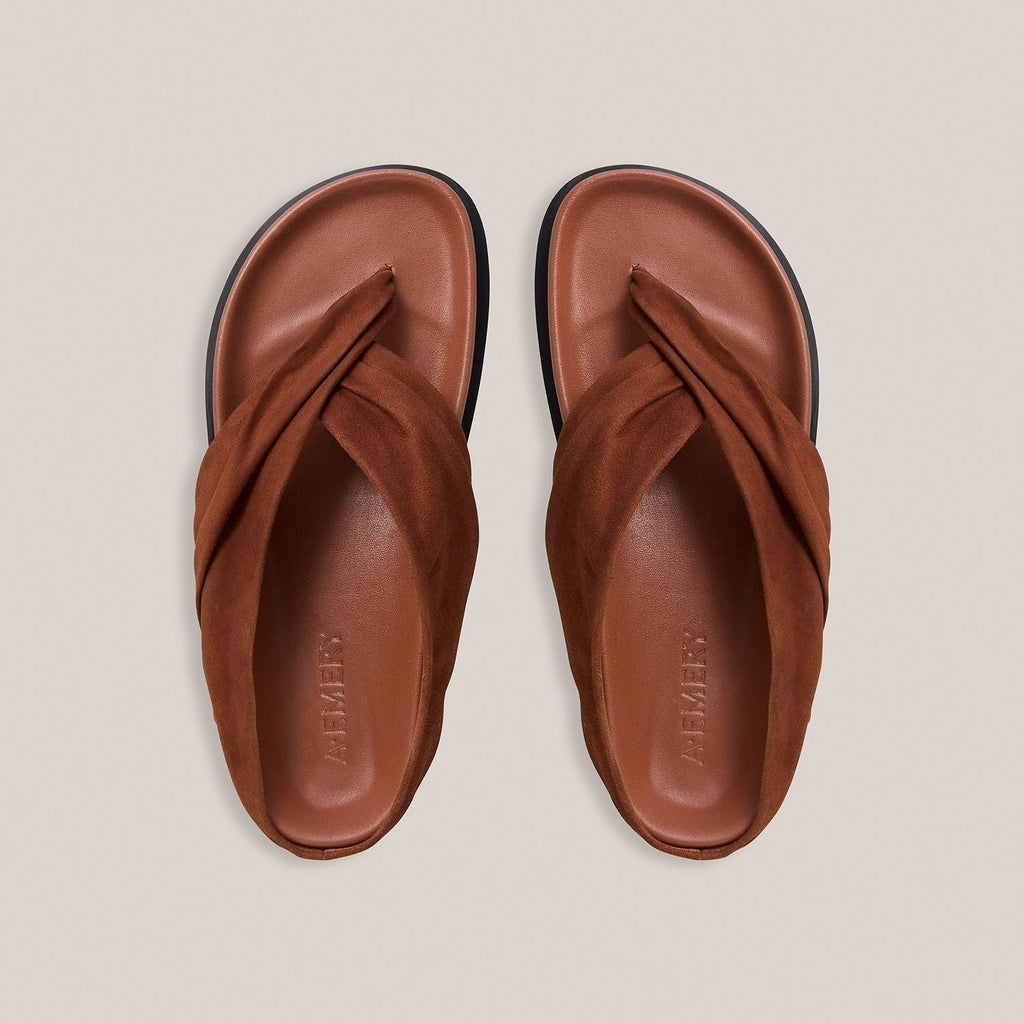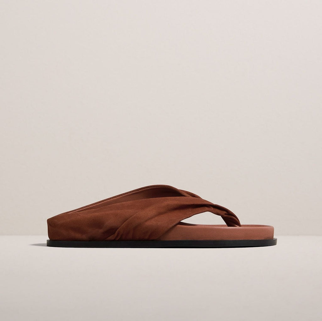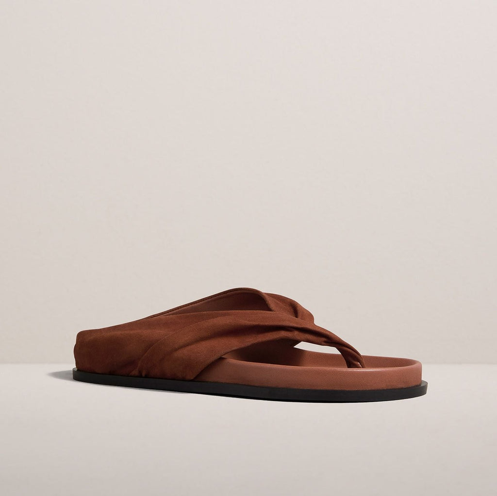 The Shaw sandal, with its moulded footbed, features two generous gathered straps in the silhouette of a flip flop, stemming from a single point for a modern look.