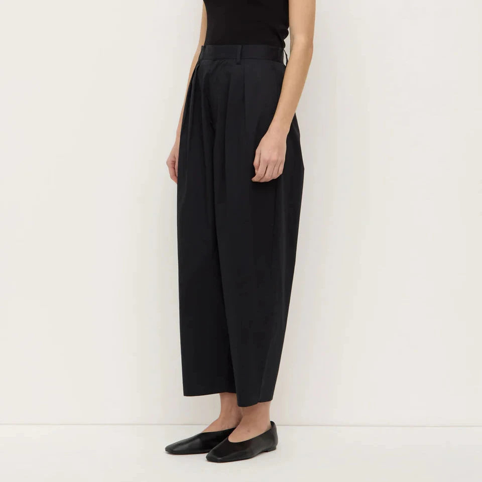 Crafted from 100% cotton, this pleat-front pant offers a cropped 3/4 length fit through the leg and a relaxed yet tailored silhouette. Features side pockets, back pockets and an internal drawcord for adjustability.