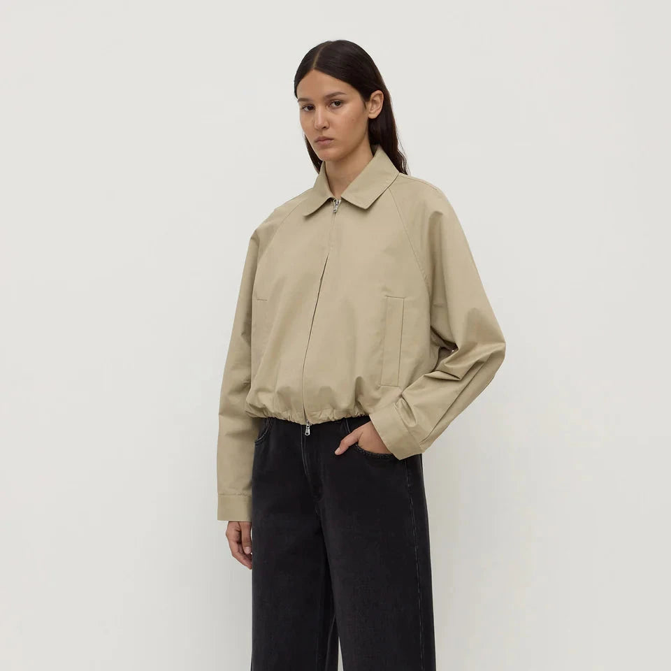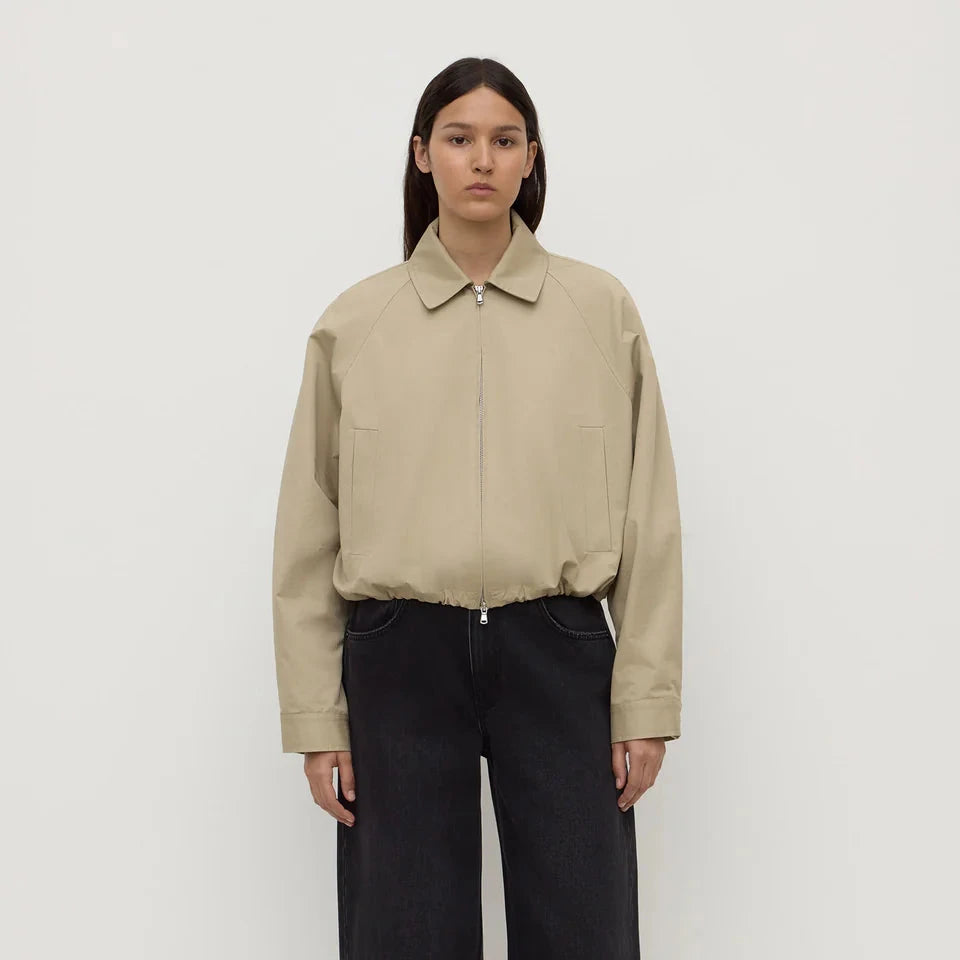 The Waverly Jacket in sand is a 100% cotton jacket with raglan sleeves and metal snap closure.