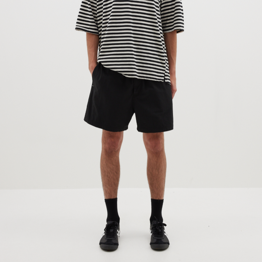relaxed pull on short featuring button and zip closure. Elasticated waistband. Back yoke with bassike branded stich detail. Side entry pockets with envelope stitch detail. Back patch pockets. Contrast bartack details on pocket openings