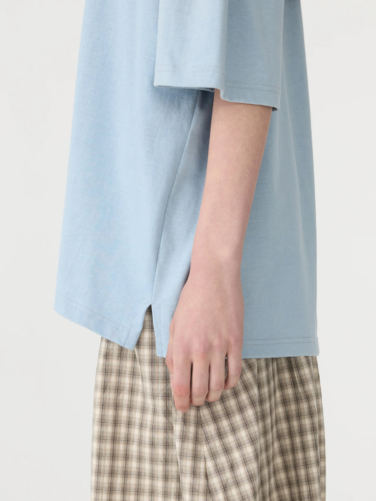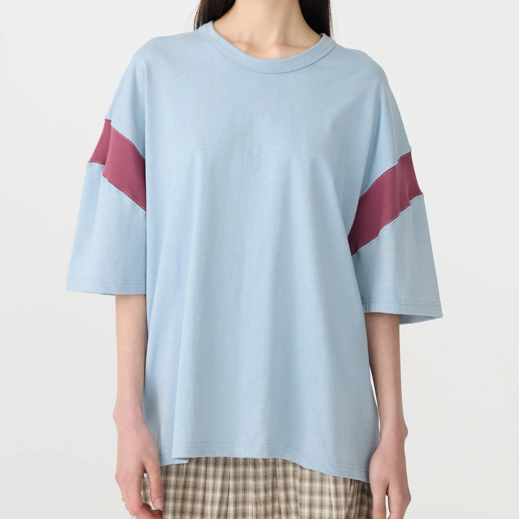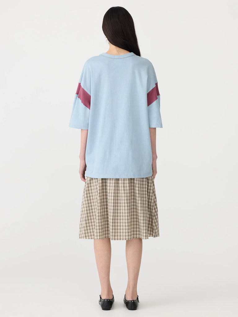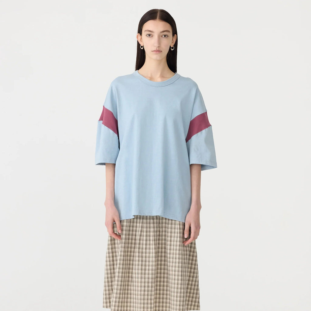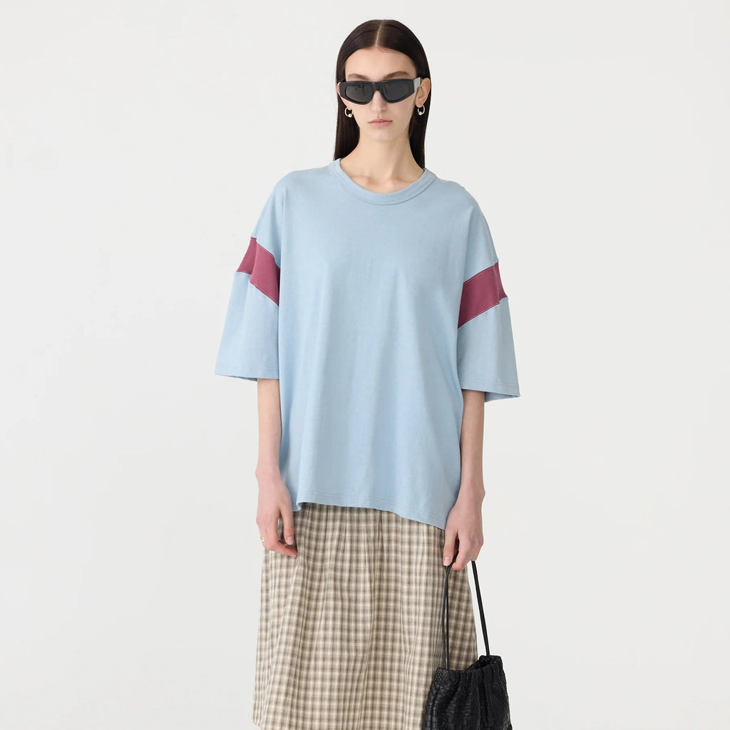 OVERSIZED RIB DETAIL T-SHIRT - PALE BLUE/BURGUNDY