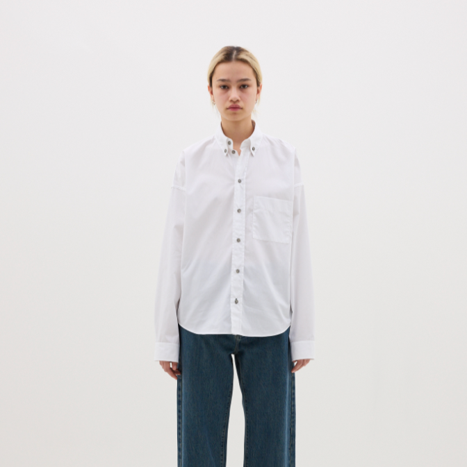 large classic mens style white shirt with a button down collar and contrast grey marl button details. Front patch pocket, back v dart branding detail.