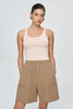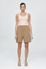 Relaxed-fit shorts crafted from a lightweight 100% cotton selected for its crisp structure and comfort. The design features a fully elasticated waistband for ease of wear and flexible fit. A mock fly is incorporated at the centre front to reference traditional tailoring details while retaining a pull-on construction. The Ren short is equipped with oversized front pockets and finished with a topstitched deep hem.