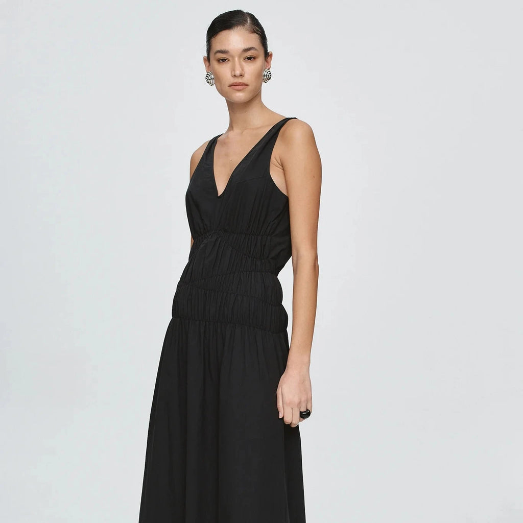 The Lyam Dress is cut from 100% Cotton, offering a crisp yet soft hand feel with a natural drape. Deep V-necklines at the front and back. Gathered elasticated channels contour the bodice and waist, creating soft definition and fluid movement through the full-length skirt.