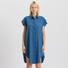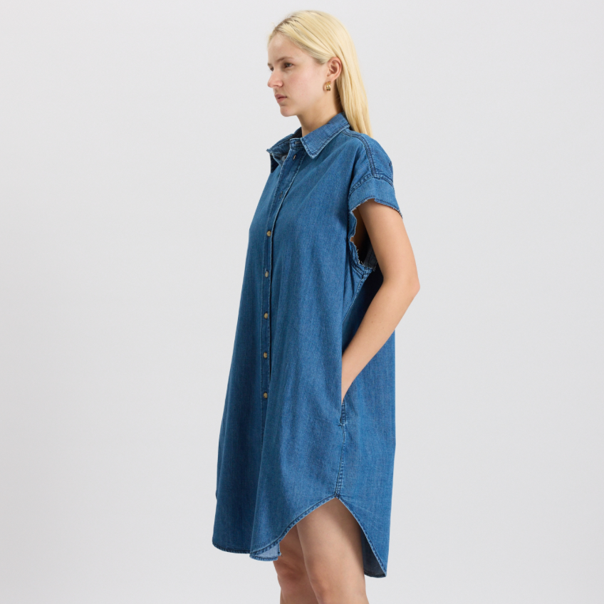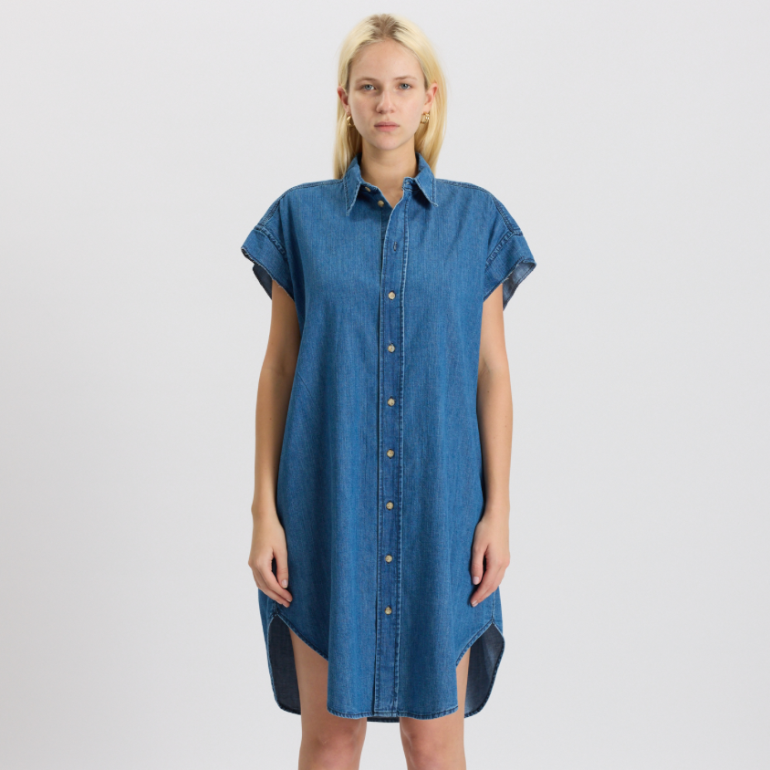 Sleeveless lightweight denim shirt dress featuring buttoned cf placket and collar, double layered back yoke, raw sleeve hems, side entry pocket bags, tonal topstitching all over