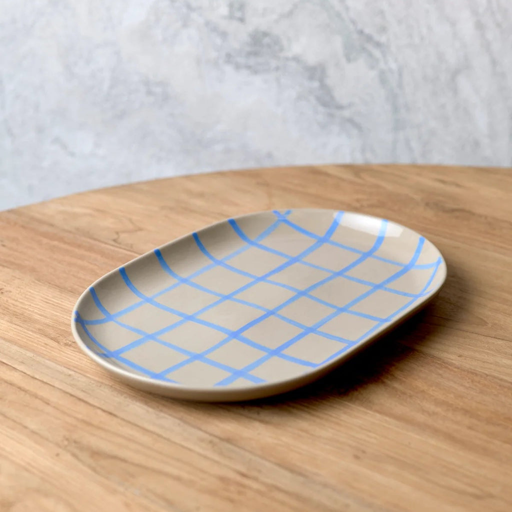 Large oval platters and shallow bowls create the perfect stage for shared meals, while condiment dishes add simple finishing touches. The carafe and latte cups stack neatly for easy storage, blending practicality with style. Available in two colourways—a vibrant hand-painted blue check and a clean, minimal linear stripe—these pieces are made to mix and match