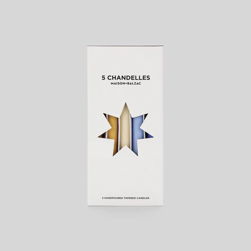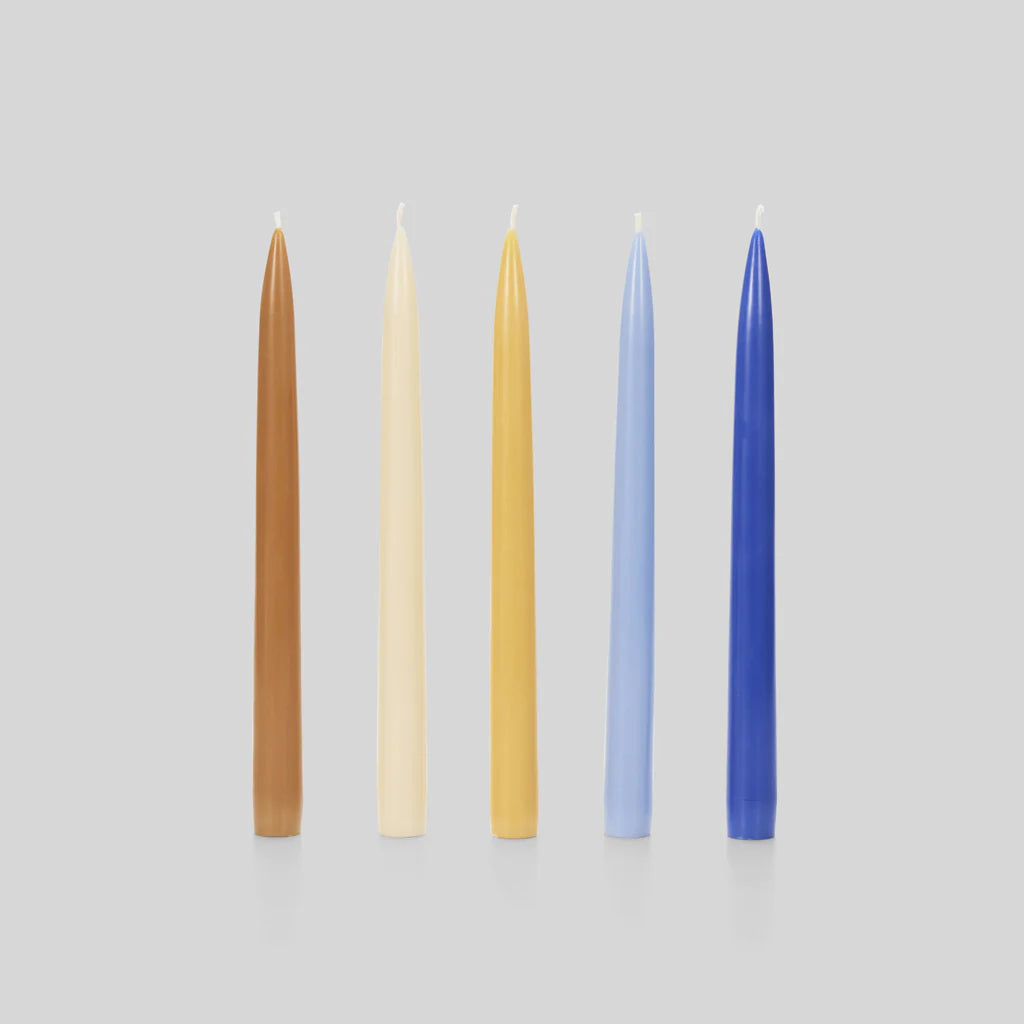 The Port Lligat set of candles tells the story of an afternoon on the beach, from the different sand colours to the various sea shades as you swim away from shore, all captured across five coloured chandelles: caramel, miel, raffia, sky, and royal blue.