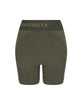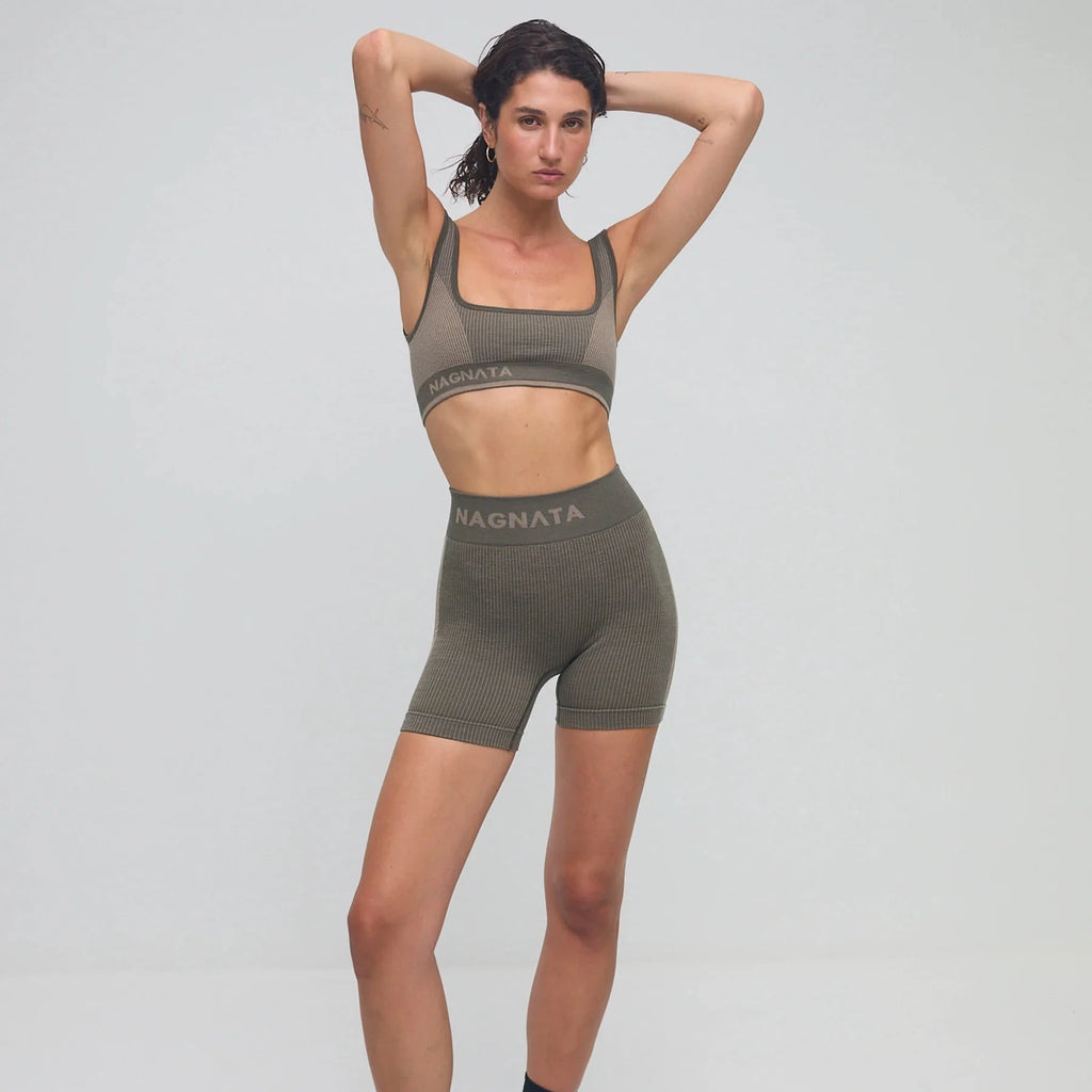 Superfine high-waisted Merino wool seamless knit rib mini short made in our signature seamless fabrication offering mild compression for support and breathability.The style features a double layer waistband with jacquard Nagnata logo on front and back waistband. Crafted in our signature Nagnata rib, these shorts include contrast jacquard stripe placement artwork.