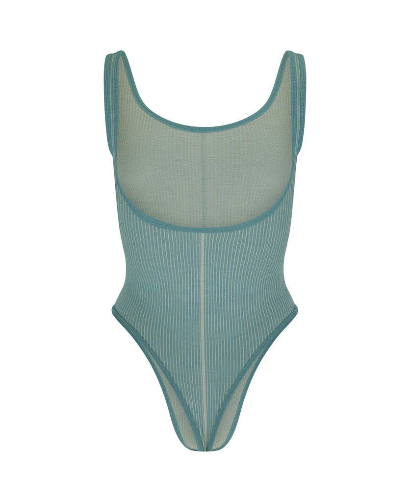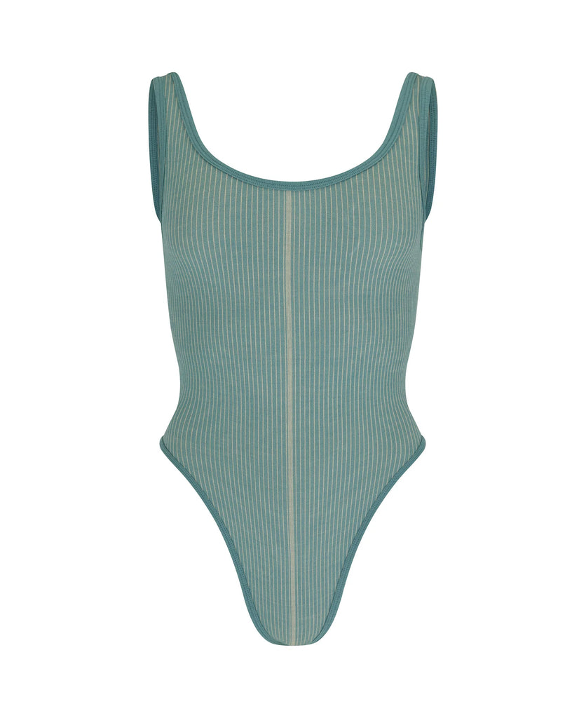 Merino wool seamless knit deep scoop bodysuit featuring a contrast vertical stripe at the centre front. Fabricated in our signature two tone rib fabrication offering mid compression. This style features a contrast hem band with a minimal jacquard logo at the back. Designed with highly breathable natural fibres for a super-soft second-skin feel against the body.