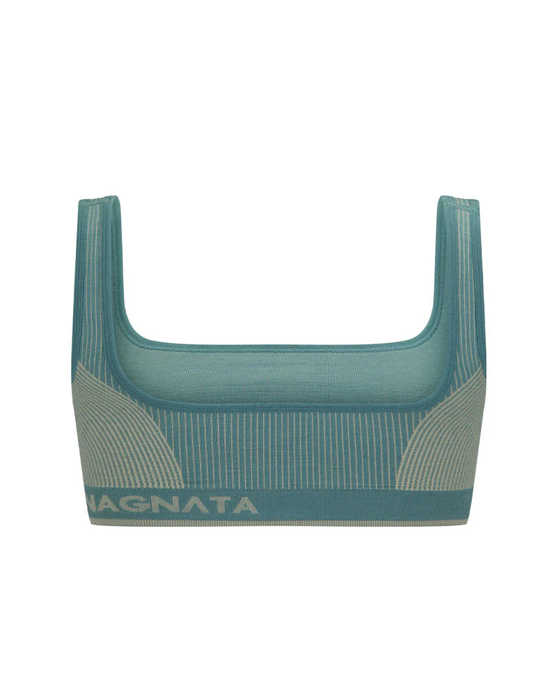 Superfine Merino wool bralet in signature Nagnata rib crafted in our seamless knitting technique, offering mild compression and support. The square neckline is complemented by a detailed contrast jacquard stripe and Nagnata logo on the back hemband. This style is fully lined for additional support and a super-soft second-skin feel against the body.