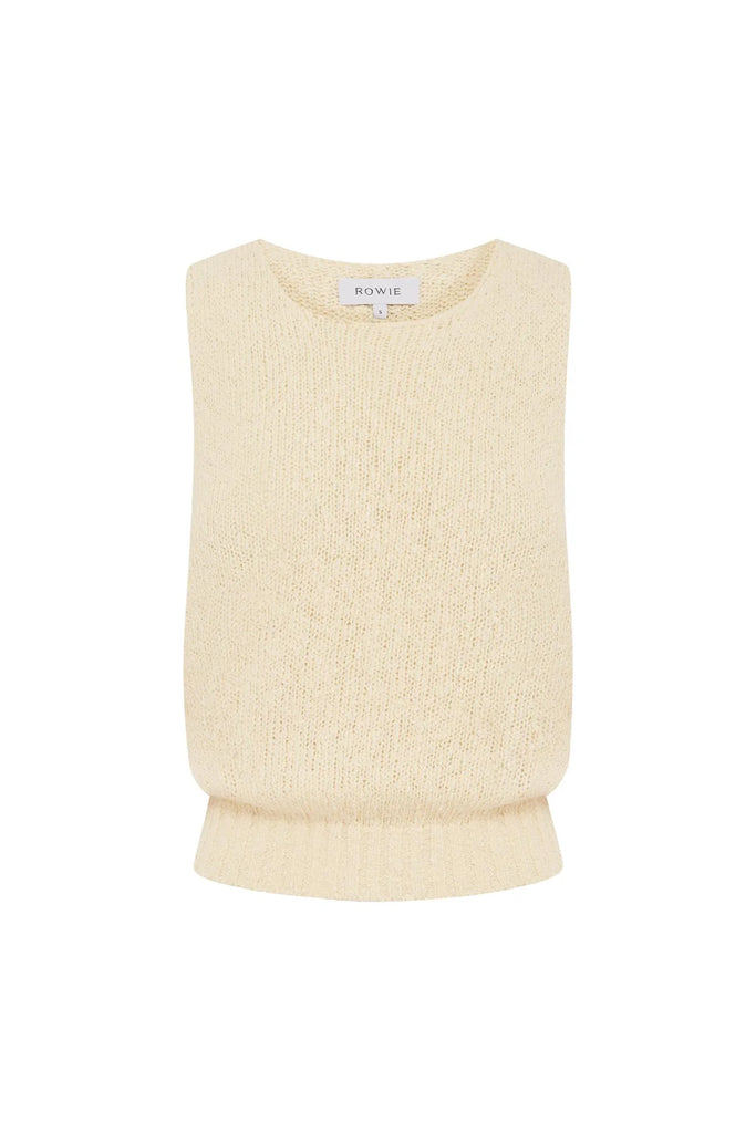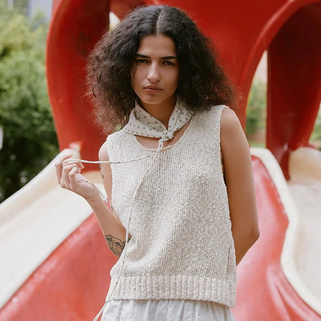 Lightweight textured yarn defines the Catalina Tank. A relaxed full-length knit with dropped armholes, side ladder detailing, and a ribbed hem finish