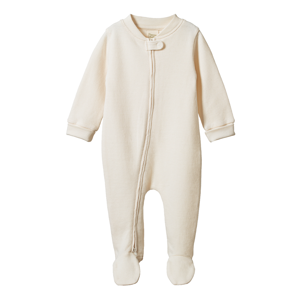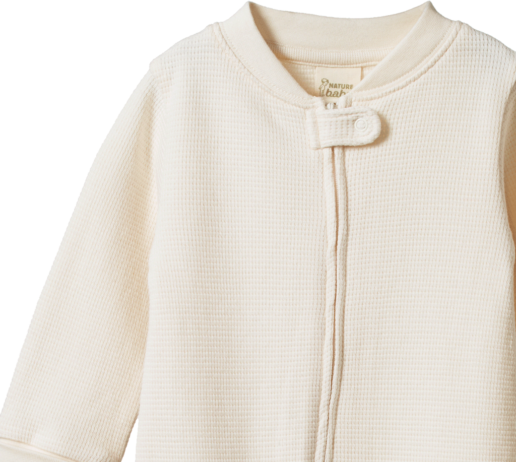 Our Dreamlands suit features a full length double ended zip for easy dressing and night-time changes. With enclosed feet to keep little one cosy overnight, in soft comfortable stretch organic waffle.