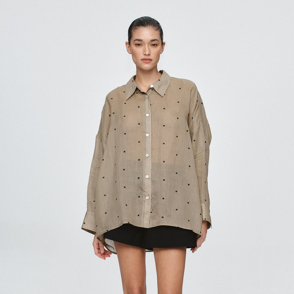 The perfect oversized shirt, this edition of the Edie is crafted from semi-sheer Ramie cloth, offering a soft yet structured hand feel. The fabric is delicately woven with a contrasting black square dot motif. Designed with a standard collar and a button-down front finished with natural shell buttons, it features an oversized, boxy shape that falls slightly longer at the back. Wide, long sleeves complete the relaxed look, detailed with two shell buttons at each cuff for a refined finish.