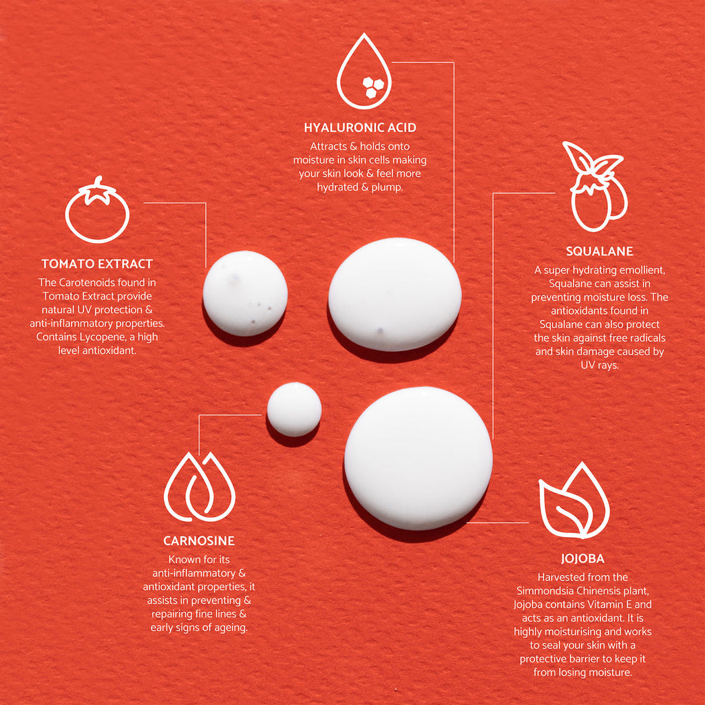 Wake up with Good Morning SPF 50 to help protect, restore and hydrate your skin while you focus on the fun stuff. Daily protection from the damaging effects of sunlight and environmental pollutants. With added Solanum Lycopersicum (Tomato Extract), Carnosine, Hyaluronic Acid, Simmondsia Chinensis (Jojoba) and Squalane.