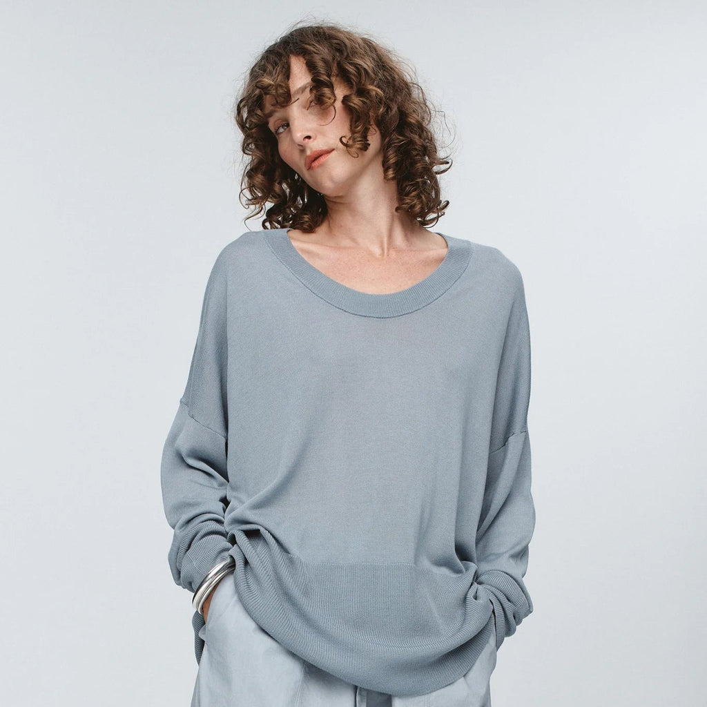 A lightweight knit, crafted from a soft, breathable cloth. Designed in a fluid, oversized shape, it falls with an easy drape, softened by a wide ribbed hem. The generous scoop neckline and subtly dropped shoulders create a relaxed yet elegant proportion, perfect for layering. With its semi-sheer finish, The Hope Jumper adds quiet dimension, balancing ease with understated sensuality.