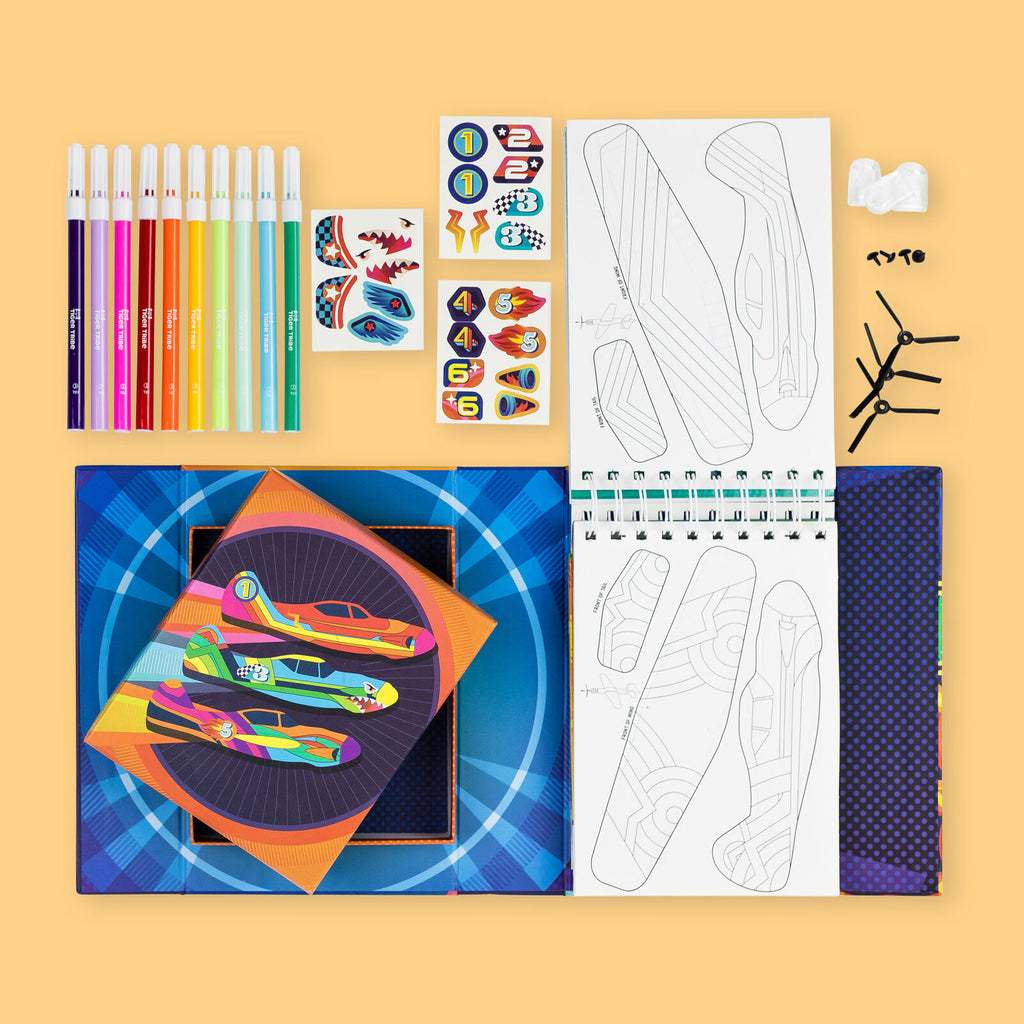 This comprehensive activity set contains pop-out planes primed for decoration with included stickers and vibrant markers. Construct the planes with propellors and aerodynamic protective nose cones to ensure a smooth flight, and the large format target sheets transition the creative activity into a fun game of skill.