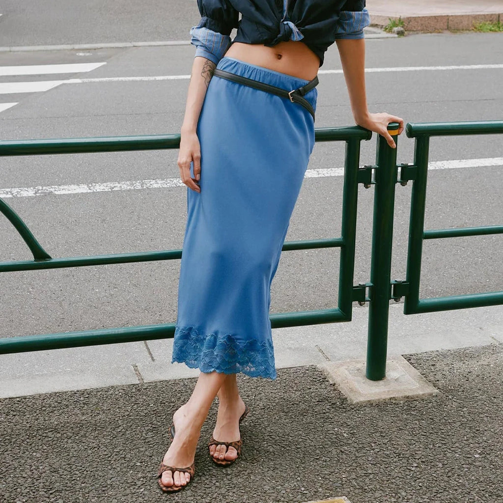 The Marina Silk Midi Skirt is an elegant take on our best-selling Marina Mini. Crafted from a blend of silk crepe and nylon lace, this high-waisted, lined, bias-cut skirt heros a delicate lace hem. Destined to to become a key player in your wardrob