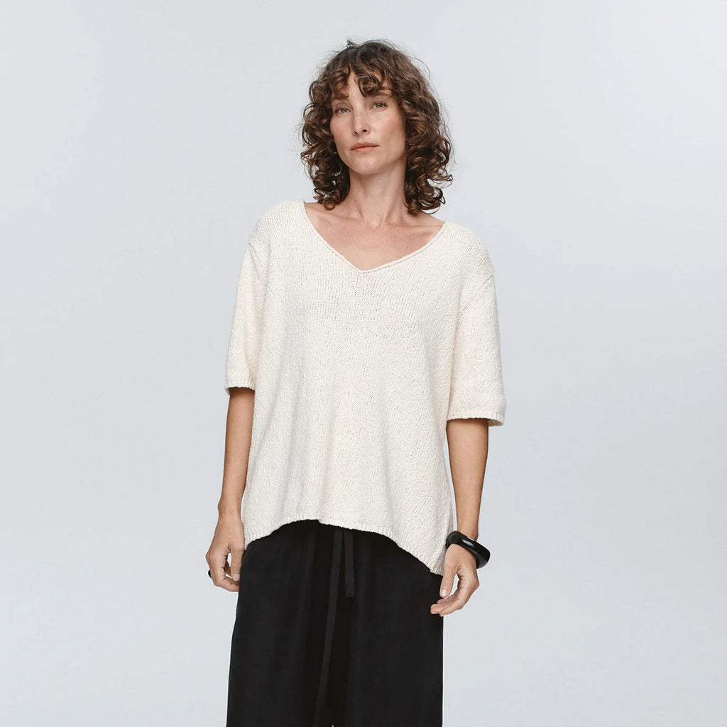 The Nya Tee offers an elevated take on everyday knitwear, crafted in a tactile, lightweight 100% Cotton. Its relaxed t-shirt shape features a wide V-neckline, short sleeves and softly ribbed edges, lending an effortless drape and understated texture.