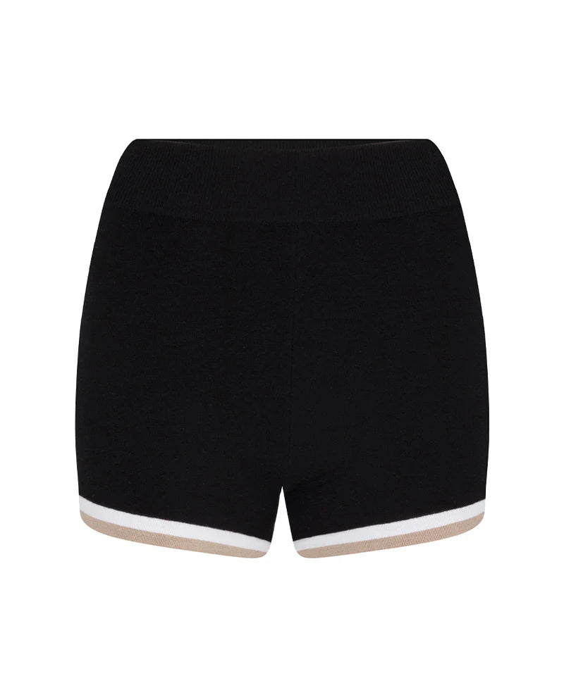 Superfine Merino Wool blend knitted mini shorts with intarsia side and hem stripe and rib waistband. Features colourblock striped panels at side seam and bottom hem. This garment is fully fashioned/engineered to shape, meaning there is minimal yarn wastage during the production process.