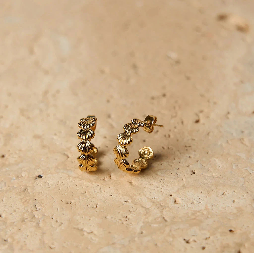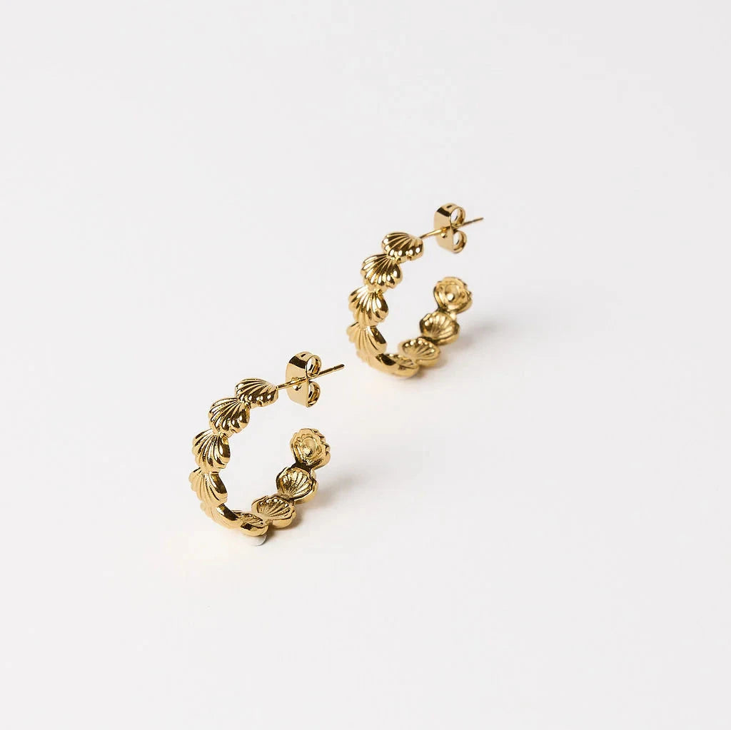 These Siren Hoop Earrings feature a stunning repeated shell pattern in gold. With their intricate design and luxurious gold finish, these earrings are the perfect statement piece for any outfit. Elevate your style and make a bold statement with these beautiful earrings.