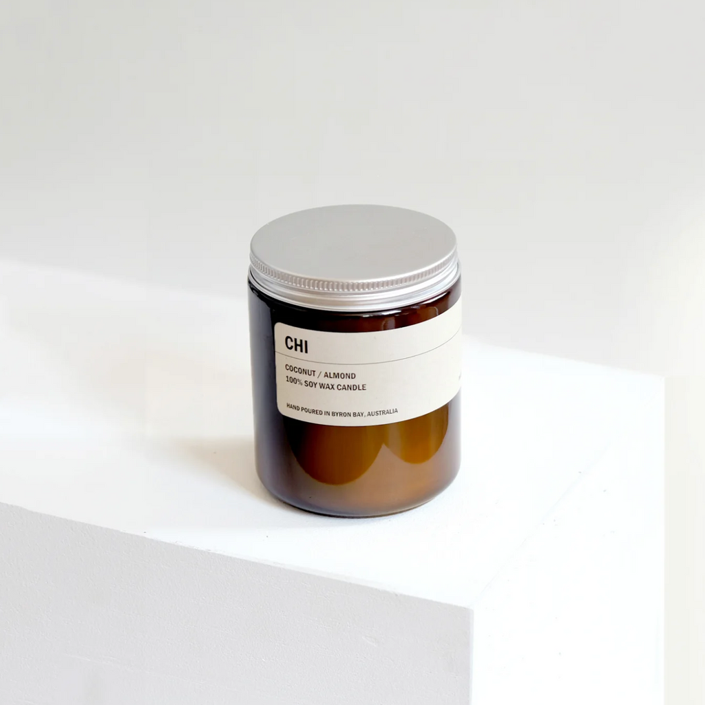 Natural 100% soy wax candle set in an amber glass jar, topped with an aluminium screw top lid.