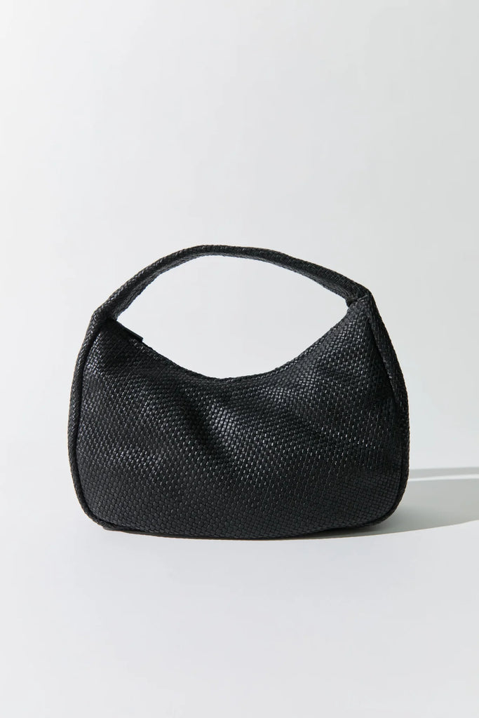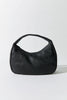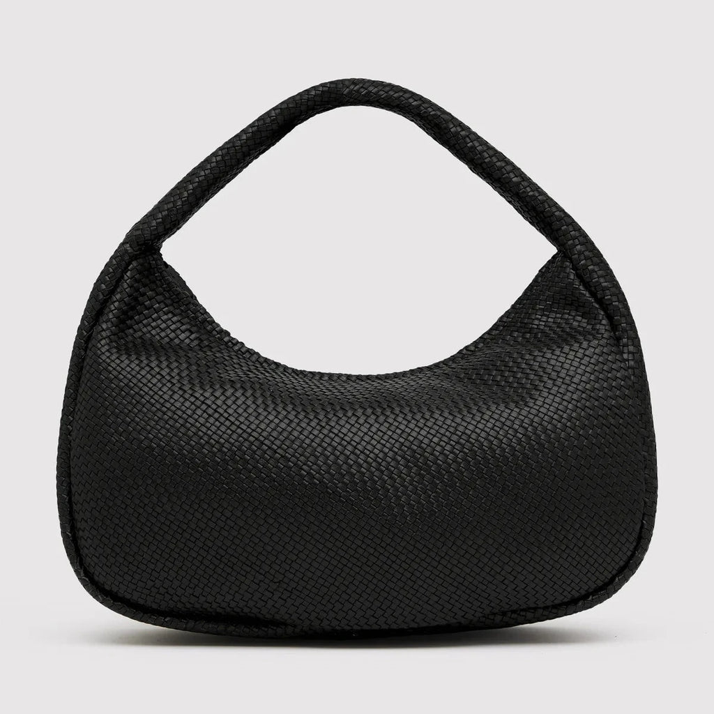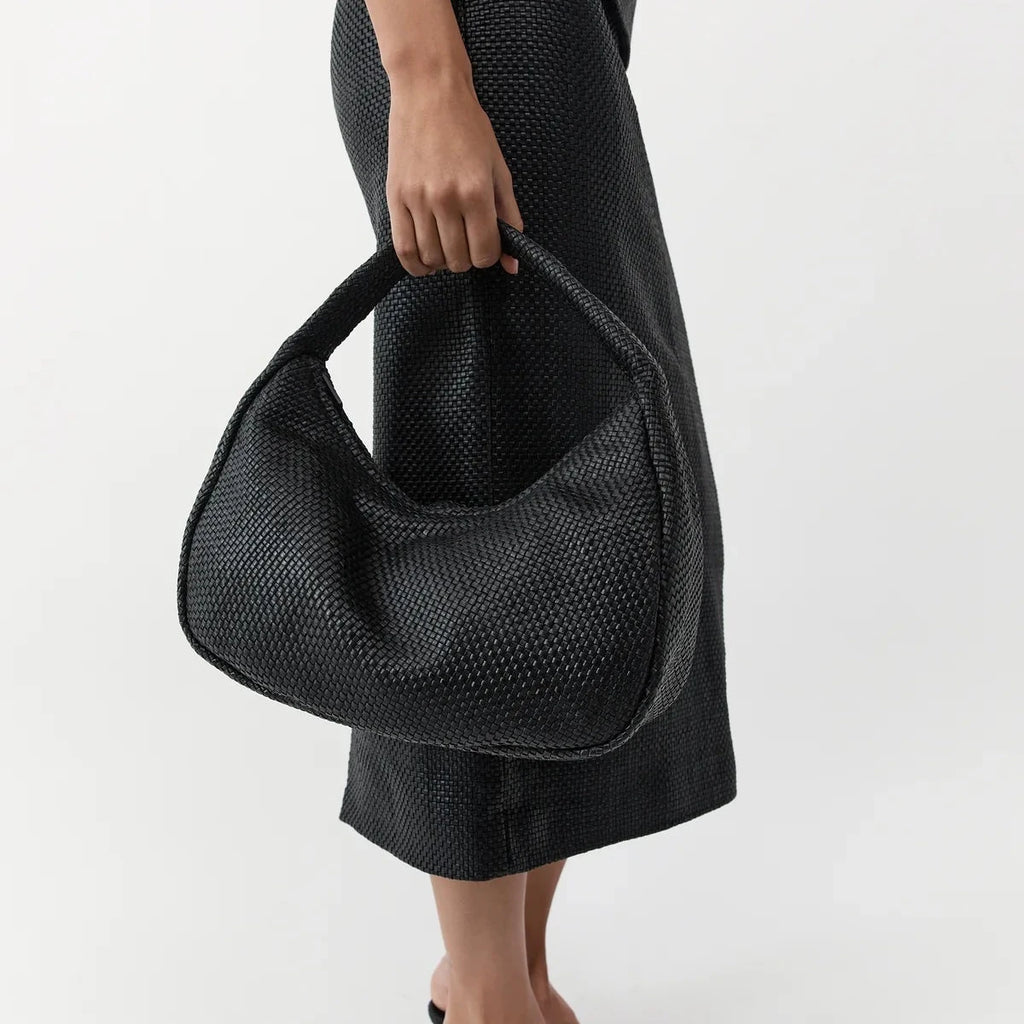 - Soft shoulder bag, rounded silhouette, woven leather body, zipper closure, internal pocket with zipper, lined