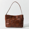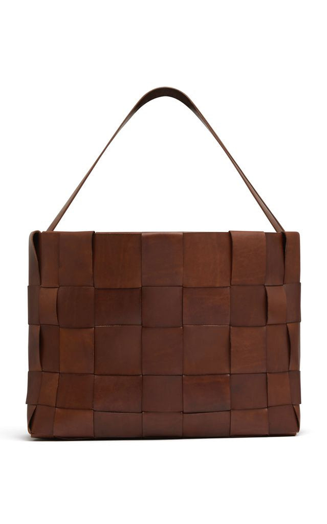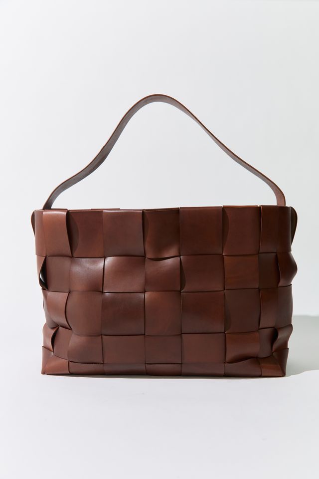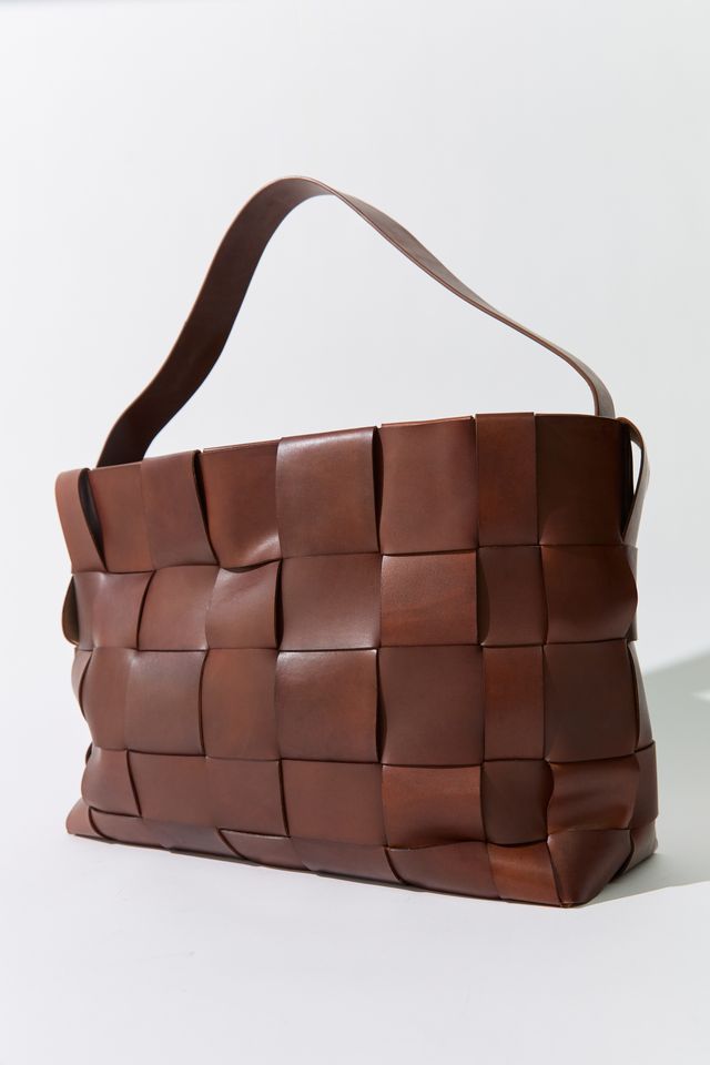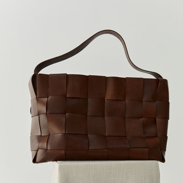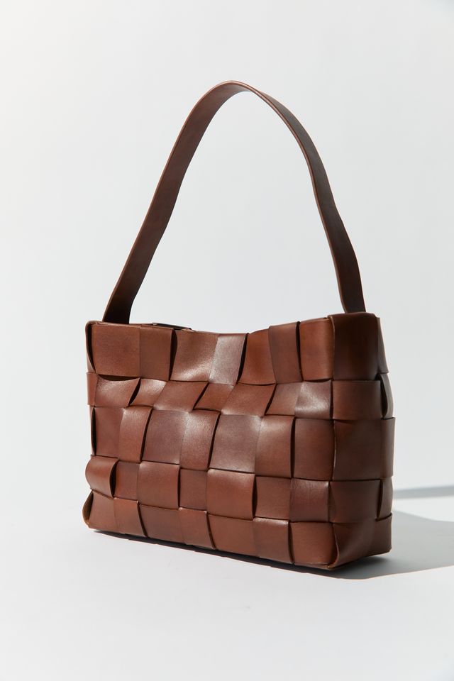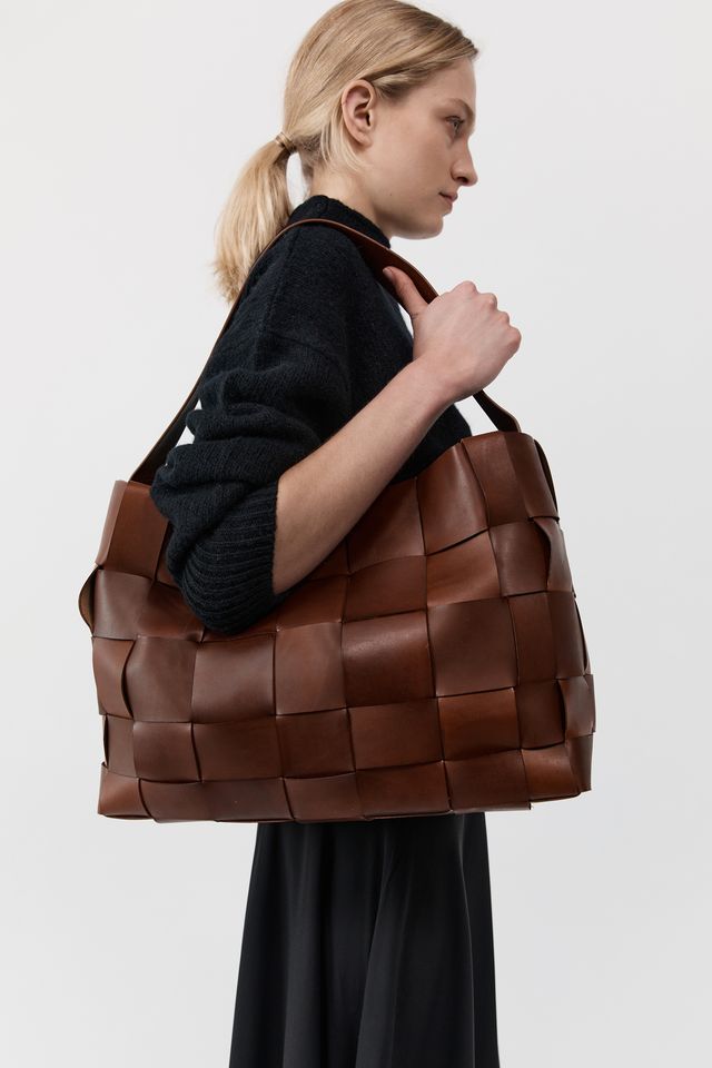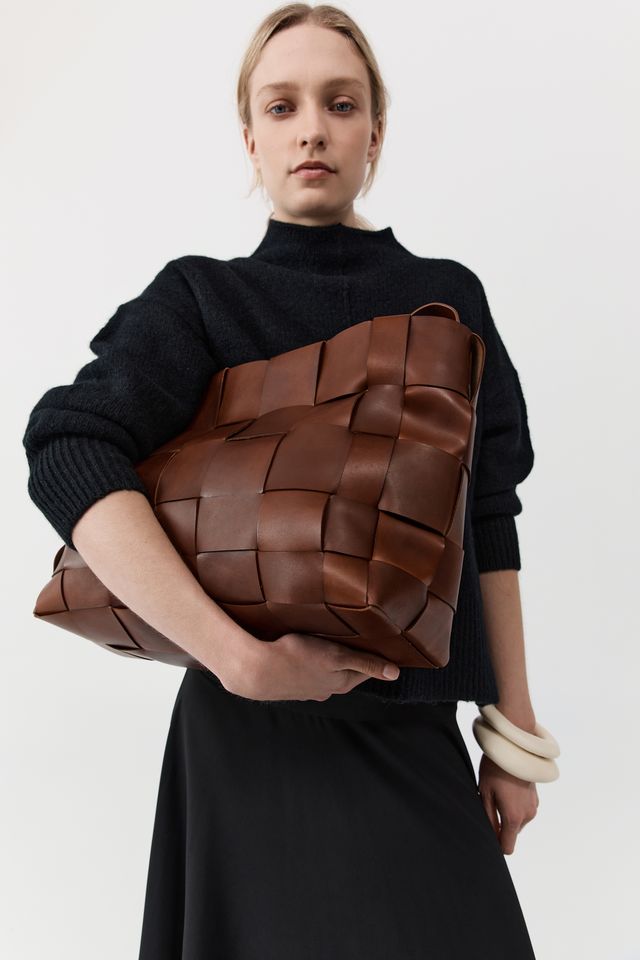 • Woven leather body, single shoulder strap, tote silhouette, internal pocket