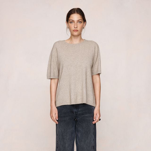 A relaxed t-shirt shape crafted in our signature Perino yarn, chosen for its softness, warmth and lightweight feel. It features a round neckline, elongated t-shirt sleeves and finished with a ribbed hem detail.