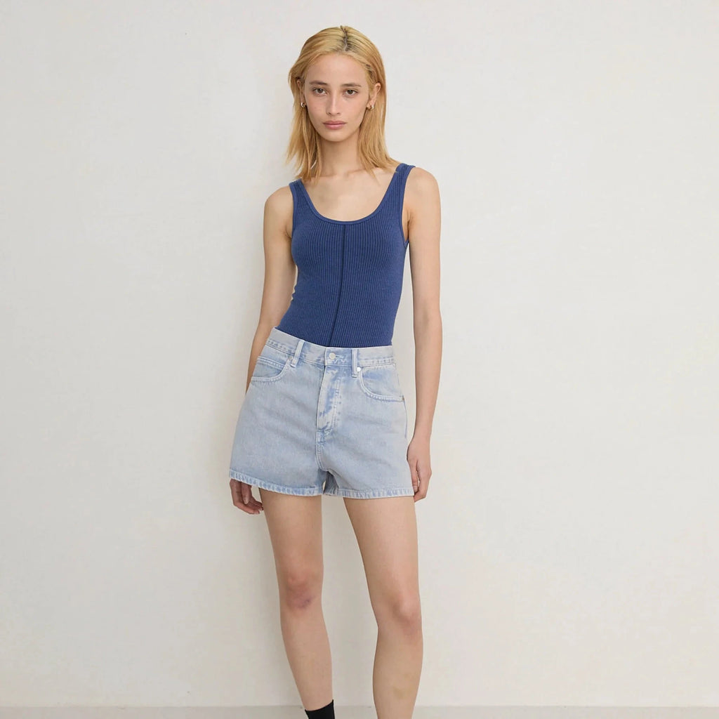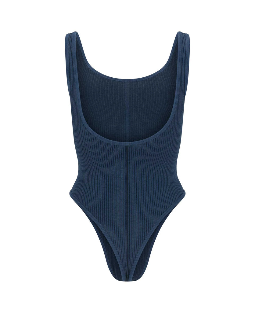 Merino wool seamless knit deep scoop bodysuit featuring a contrast vertical stripe at the centre front. Fabricated in our signature two tone rib fabrication offering mid compression. This style features a contrast hem band with a minimal jacquard logo at the back. Designed with highly breathable natural fibres for a super-soft second-skin feel against the body.