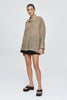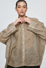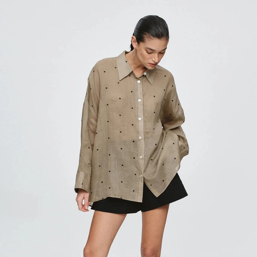 The perfect oversized shirt, this edition of the Edie is crafted from semi-sheer Ramie cloth, offering a soft yet structured hand feel. The fabric is delicately woven with a contrasting black square dot motif. Designed with a standard collar and a button-down front finished with natural shell buttons, it features an oversized, boxy shape that falls slightly longer at the back. Wide, long sleeves complete the relaxed look, detailed with two shell buttons at each cuff for a refined finish.