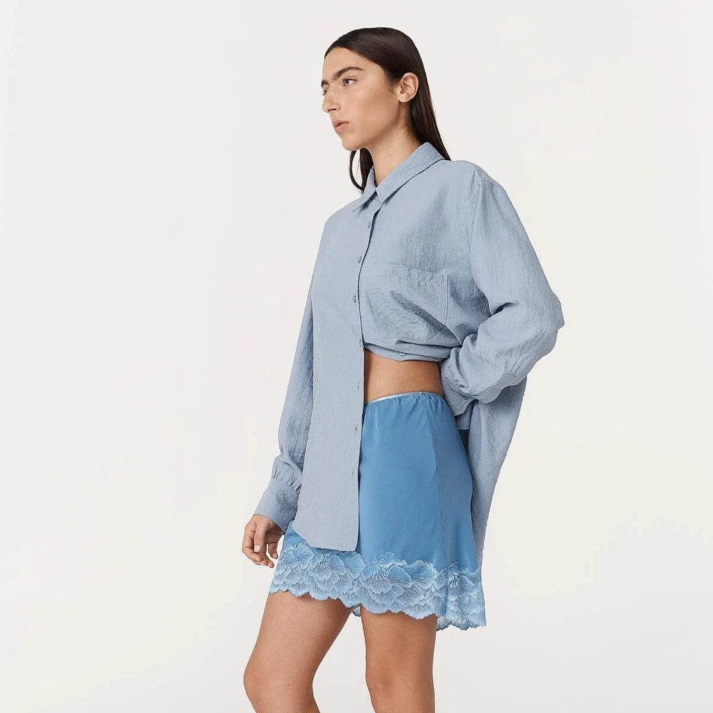 Our cult-favourite Marina Silk Mini Skirt in Cornflower blue. Crafted from a blend of silk crepe and nylon lace, this high-waisted, bias-cut skirt heros a delicate lace hem. Discover why we can't get enough of this best-selling mini