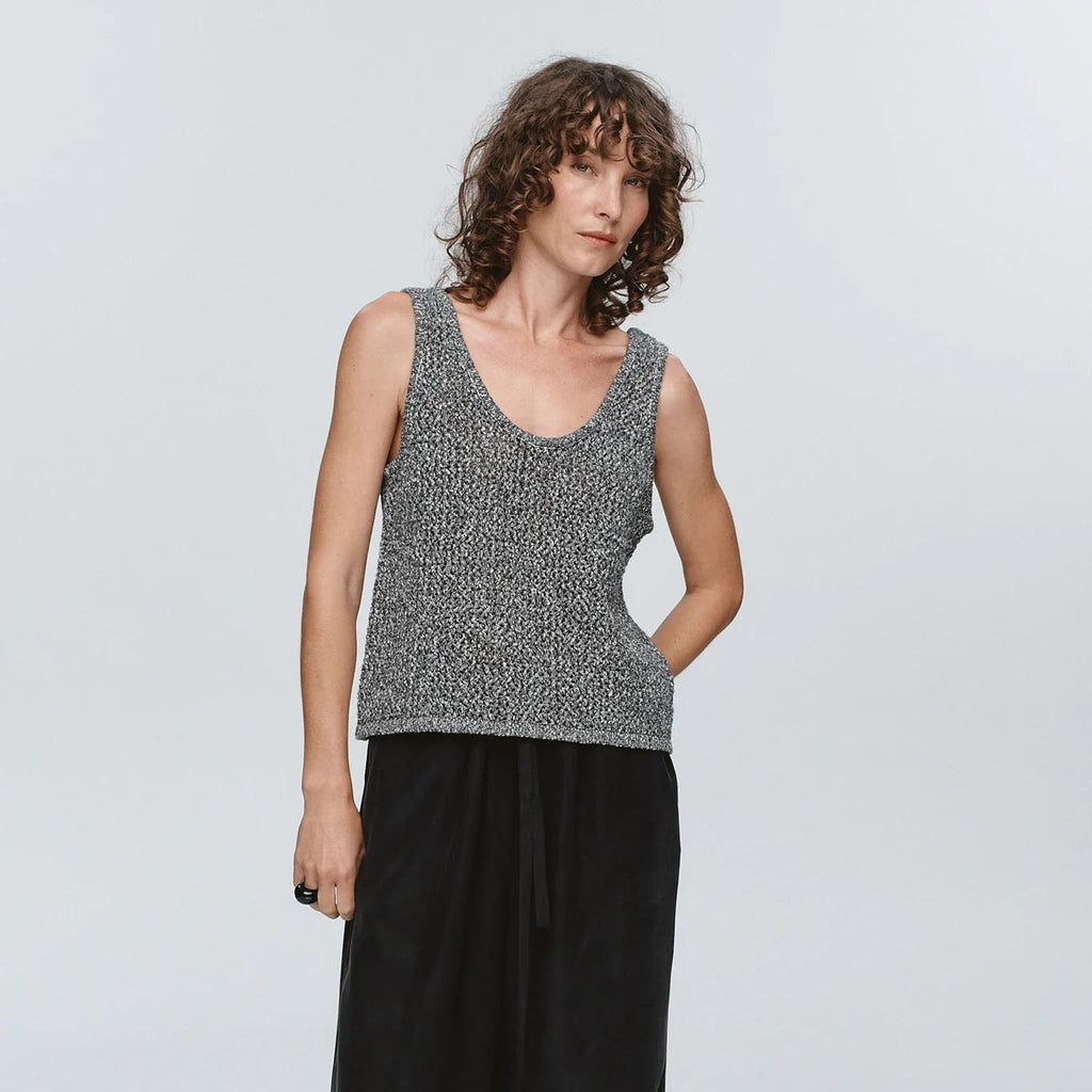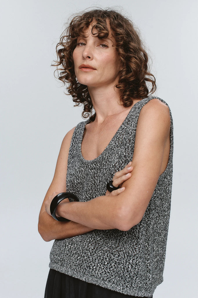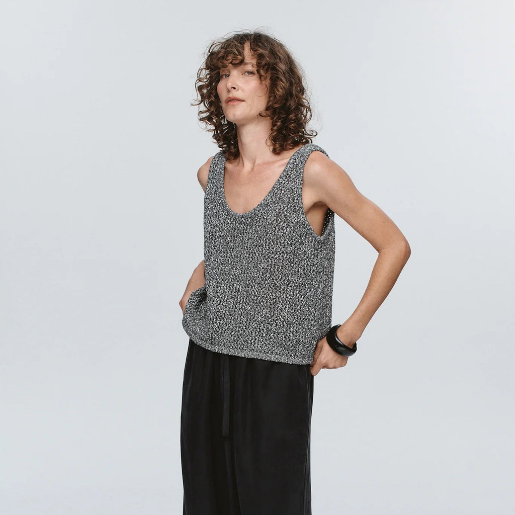Sleeveless knit top constructed in a 100% cotton, black and ivory mélange yarn. Features a wide scoop neckline and a relaxed, draped shape that falls straight through the body.