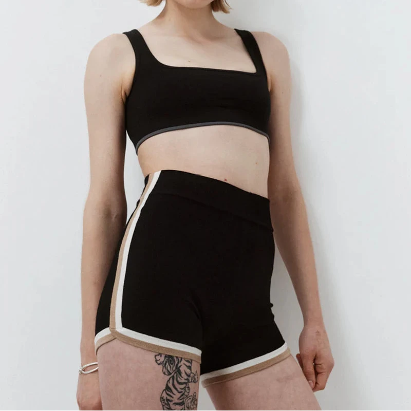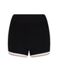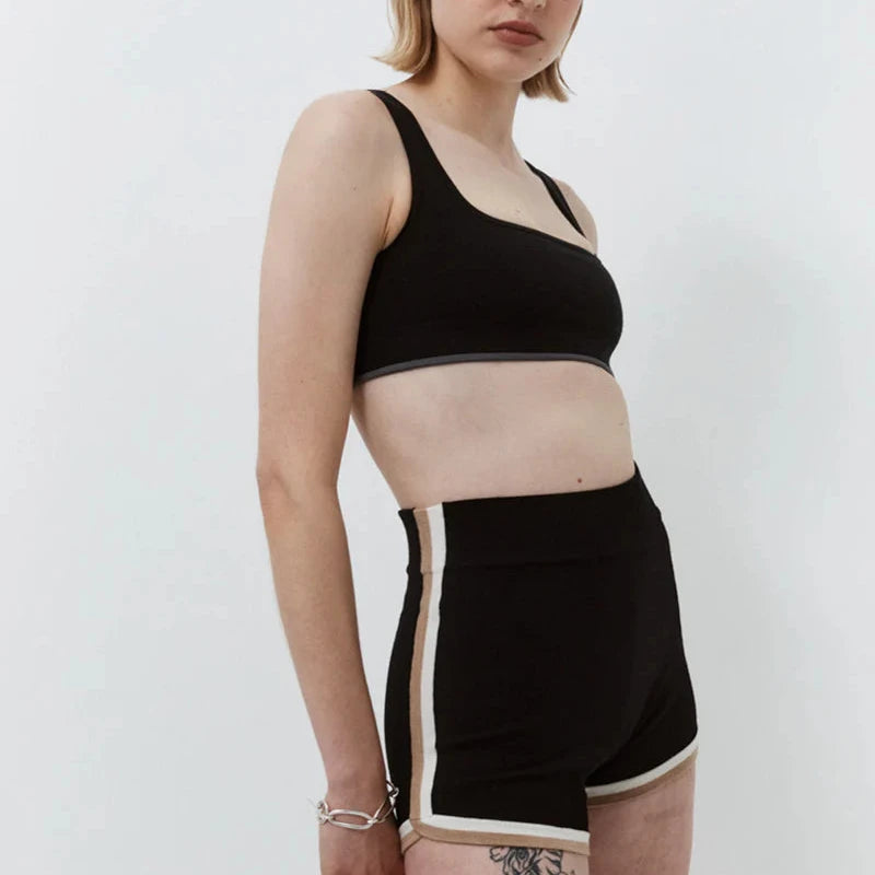 Superfine Merino Wool blend knitted mini shorts with intarsia side and hem stripe and rib waistband. Features colourblock striped panels at side seam and bottom hem. This garment is fully fashioned/engineered to shape, meaning there is minimal yarn wastage during the production process.