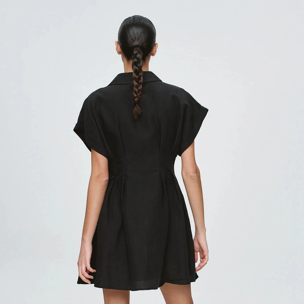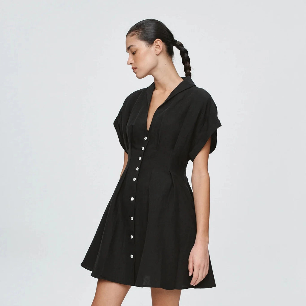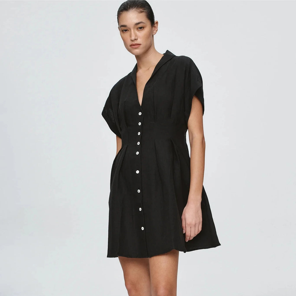 A mini length dress constructed from a linen / cotton cloth. Features a clean, deep-V neckline, wide short sleeves and a full button-through front closure. Includes side seam pockets for functionality and pleat detailing at the front for controlled volume and ease of movement. Designed for a relaxed fit that drapes from the shoulder.