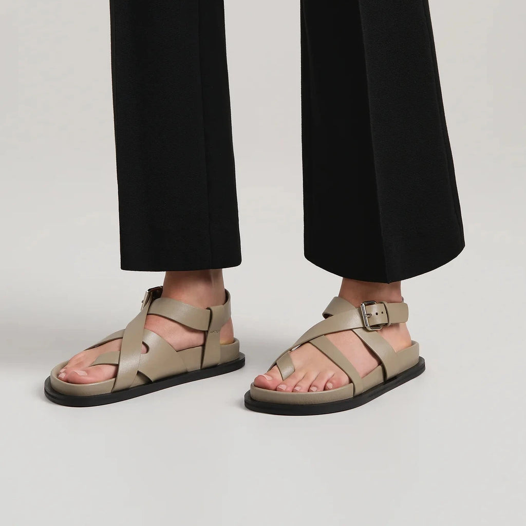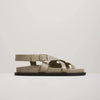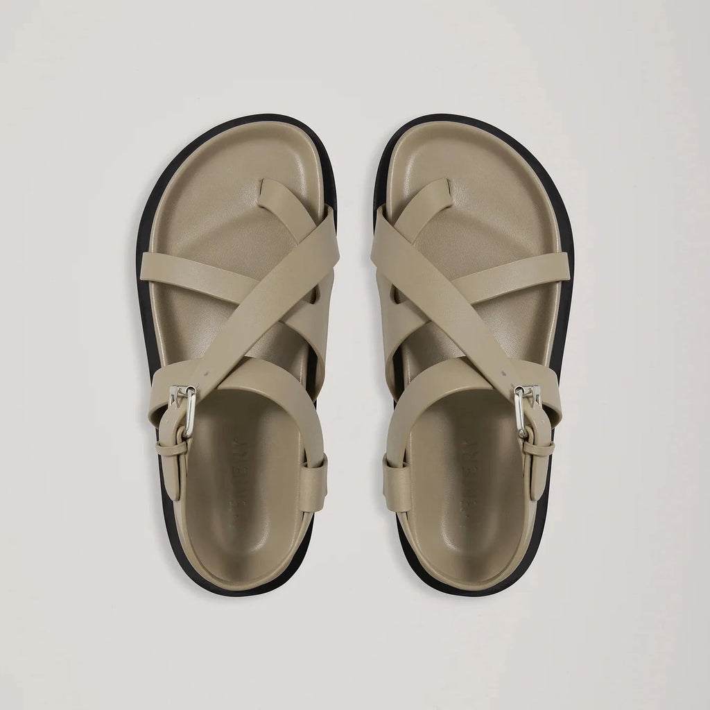 The Elbert Sandal sits atop a moulded footbed with diagonal straps that wrap around the foot forming an ankle strap, secured with a silver statement buckle.