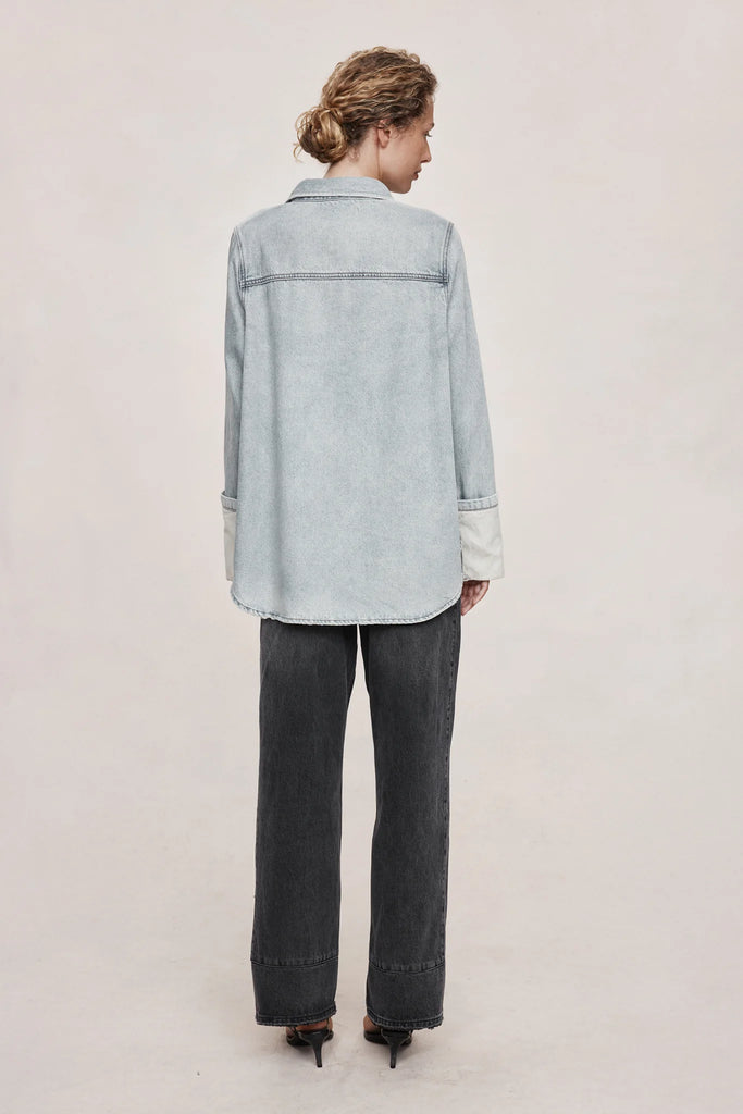 Crafted from soft 100% organic cotton, this oversized shirt features a relaxed, A-line shape. Featuring a classic collar, concealed front placket with snap domes and two oversized patch pockets at the chest. The sleeves are designed with folded, elongated cuffs. Finished with tonal topstitching and subtly distressed hems.