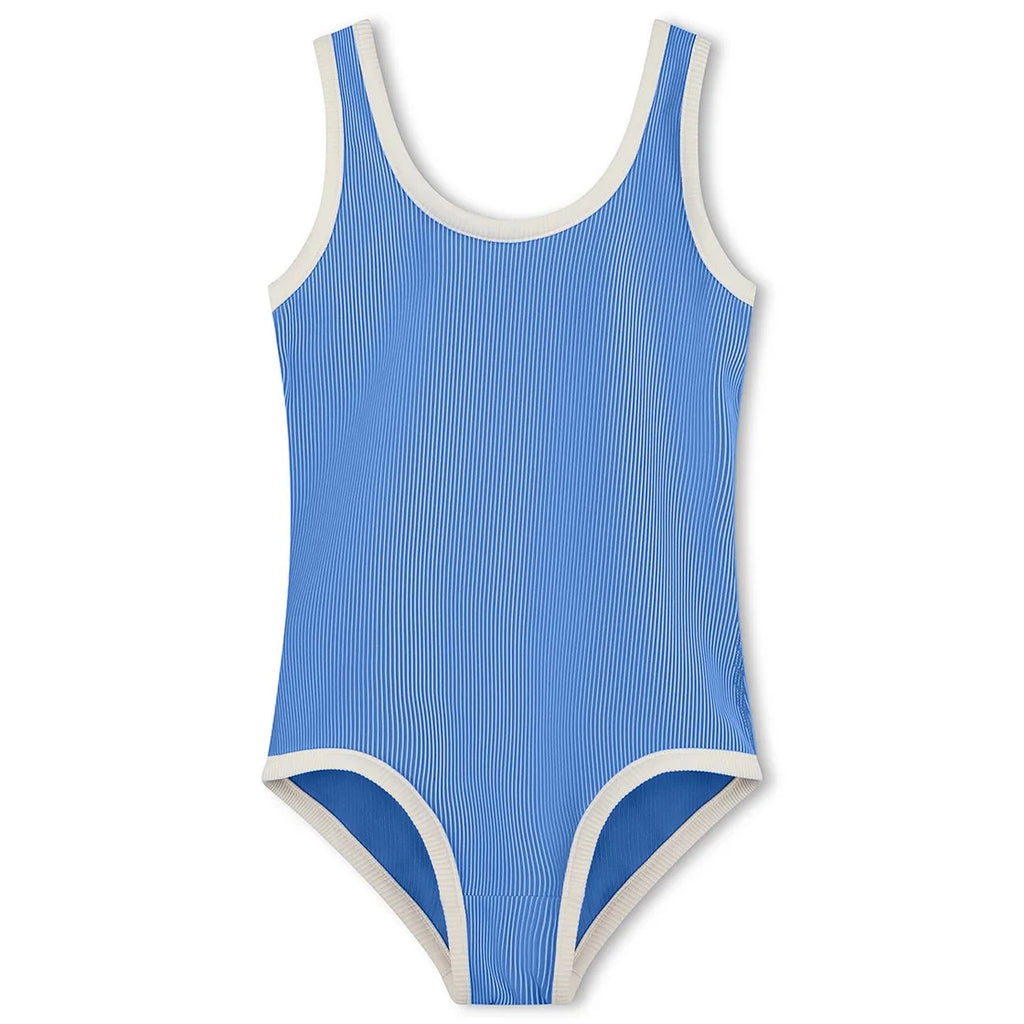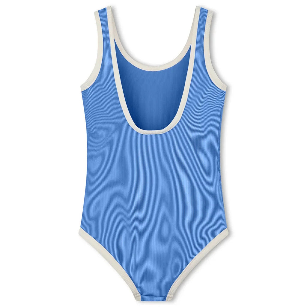 This playful kids' one-piece features retro contrast rib binds, a scoop back, and comfy chunky straps.
