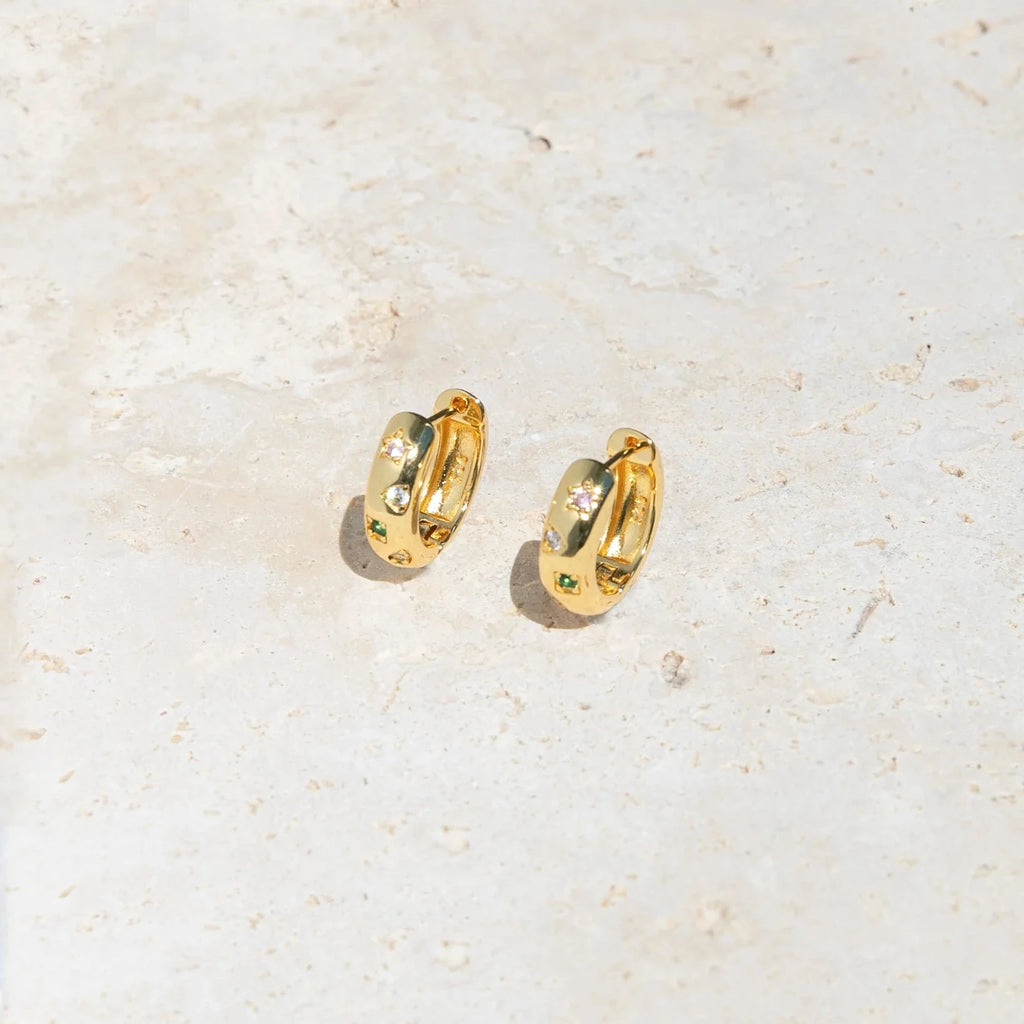 Elevate your accessory collection with the Beau Earrings in gold, featuring a delicate hoop design adorned with vibrant rainbow stones. Expertly crafted, these earrings offer a refined balance of subtle elegance and colourful charm, perfect touch to any outfit.