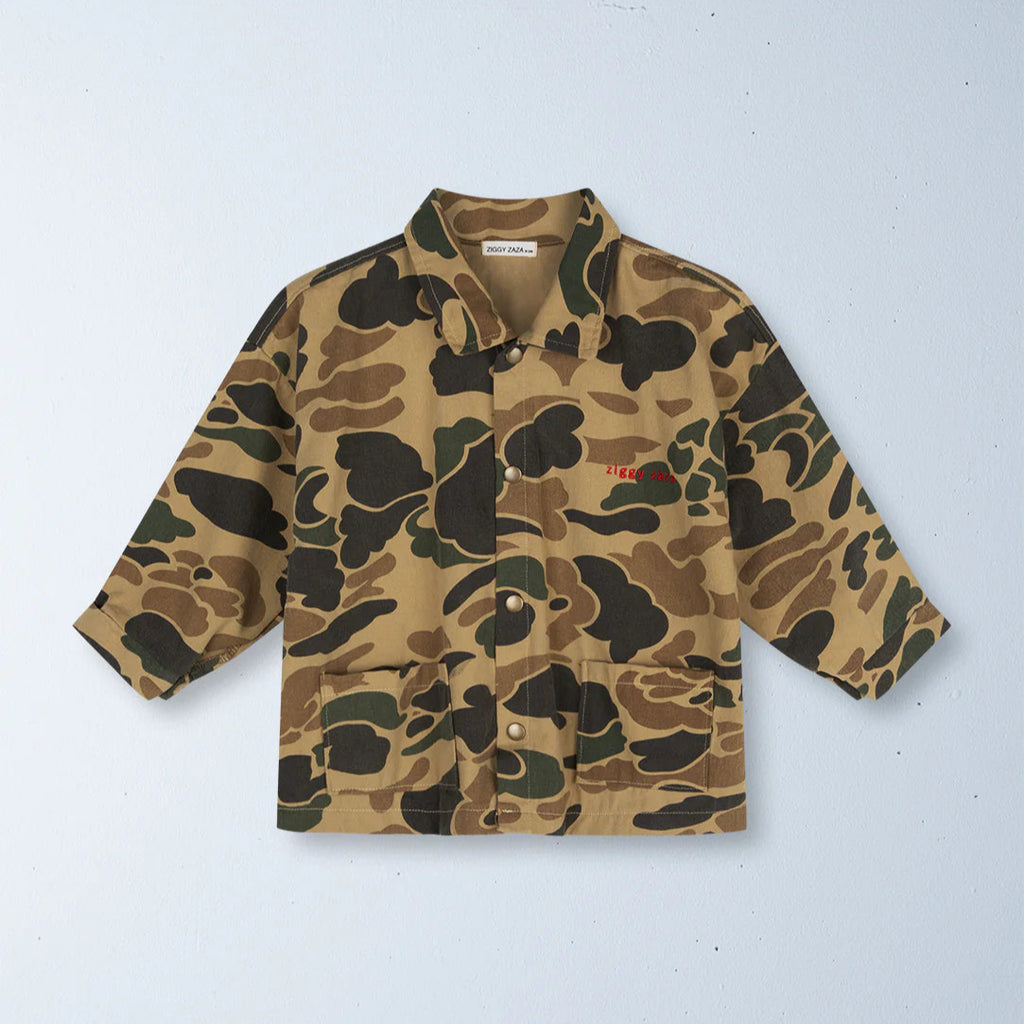 a military inspired jacket reimagined for little adventurers. Made from durable cotton drill, this boxy-fit jacket features an all-over camouflage print with a contrast logo embroidery in red on the chest, brass snap-button front, and utility-style pockets. Ideal for layering in winter and can be worn on its own in the warmer months.